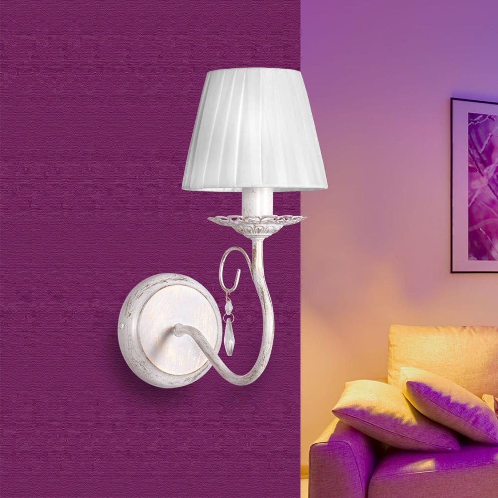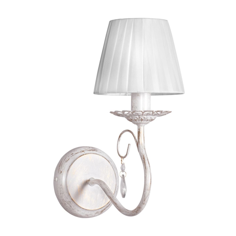 Бра с абажуром российского производства Петрасвет S1038-1, 1хЕ14 макс, 60Вт, стиль - классика свечи, арматура - металл, цвет светильника - белый с патиной золота, размеры светильника (LxWxH) - 30x14x25, вес - 0,3 кг.