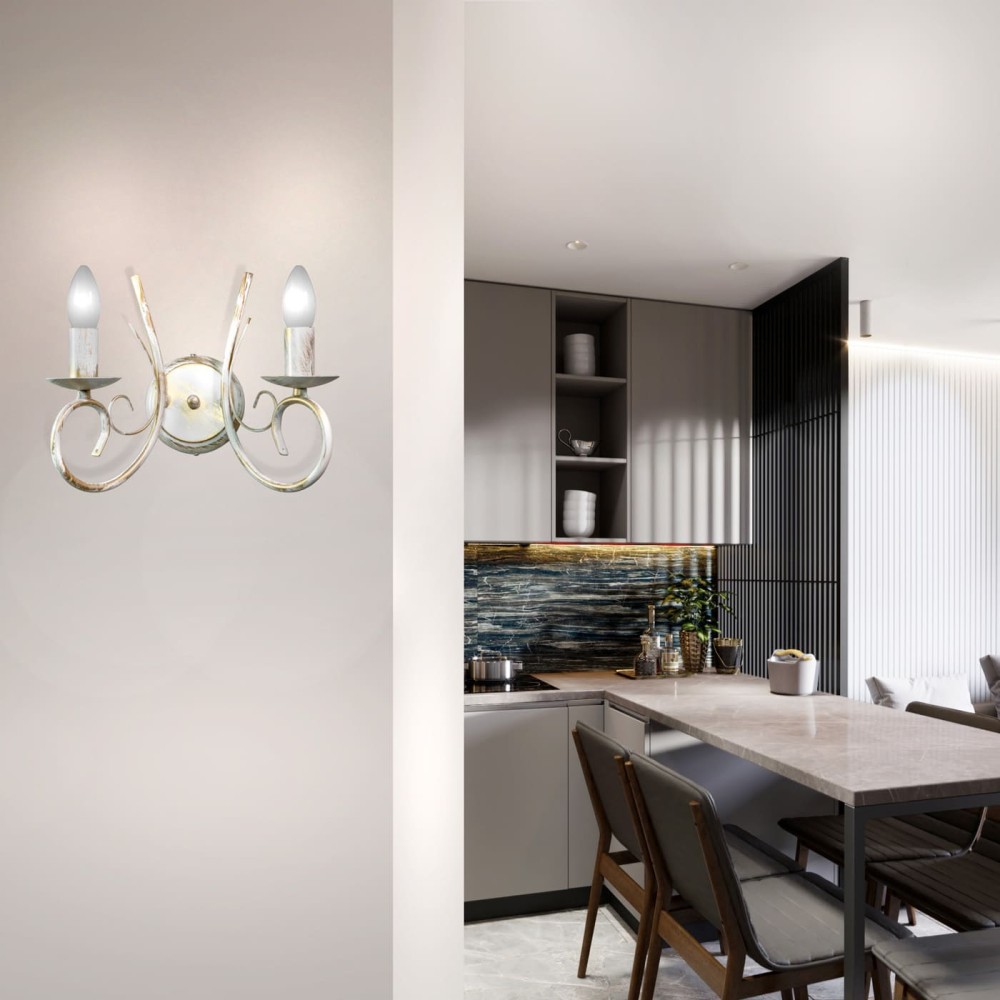 - Элегантный Дизайн: Бра сочетает в себе элементы классической и неоклассической стилистики. Белый цвет с патиной золота придает светильнику благородный и изысканный вид, делая его настоящим украшением любого помещения. Патинирование металла создает эффект состаренного золота, добавляя светильнику глубину и текстуру.
