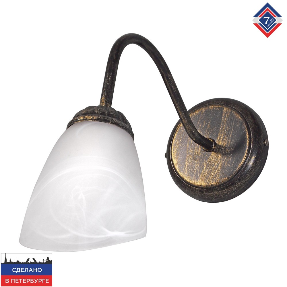 Бра стекло российского производства ПЕТРАСВЕТ S2374-1, 1хЕ14 макс, 60Вт с плафоном из стекла, стиль - классический, арматура - металл, цвет светильника- черный с патиной золота, размеры светильника (LxWxH) - 30x12x18, вес - 0,5 кг, Настенный светильник бра рассчитан на освещение 3-6 м2 помещения в зависимости от мощности лампочек Е14, Светильник настенный крепится стандартной планкой к стене, Бра и люстра в комплекте купить можно к любой серии российского производства ПЕТРАСВЕТ, Бра настенные подходят для освещения комнат, кабинета, гостиной, спальни, столовой, детской, кухни, Заводская гарантия 7 лет, Настенные светильник бра поставляется полностью собранный и плотно уложен в коробке, Бра крепится к стене стандартной потолочной планкой, Лампочки светодиодные LED подбираются по следующим параметрам: для яркого освещения - 3 Вт на 1 м2 комнаты, для среднего - 2 Вт ,
