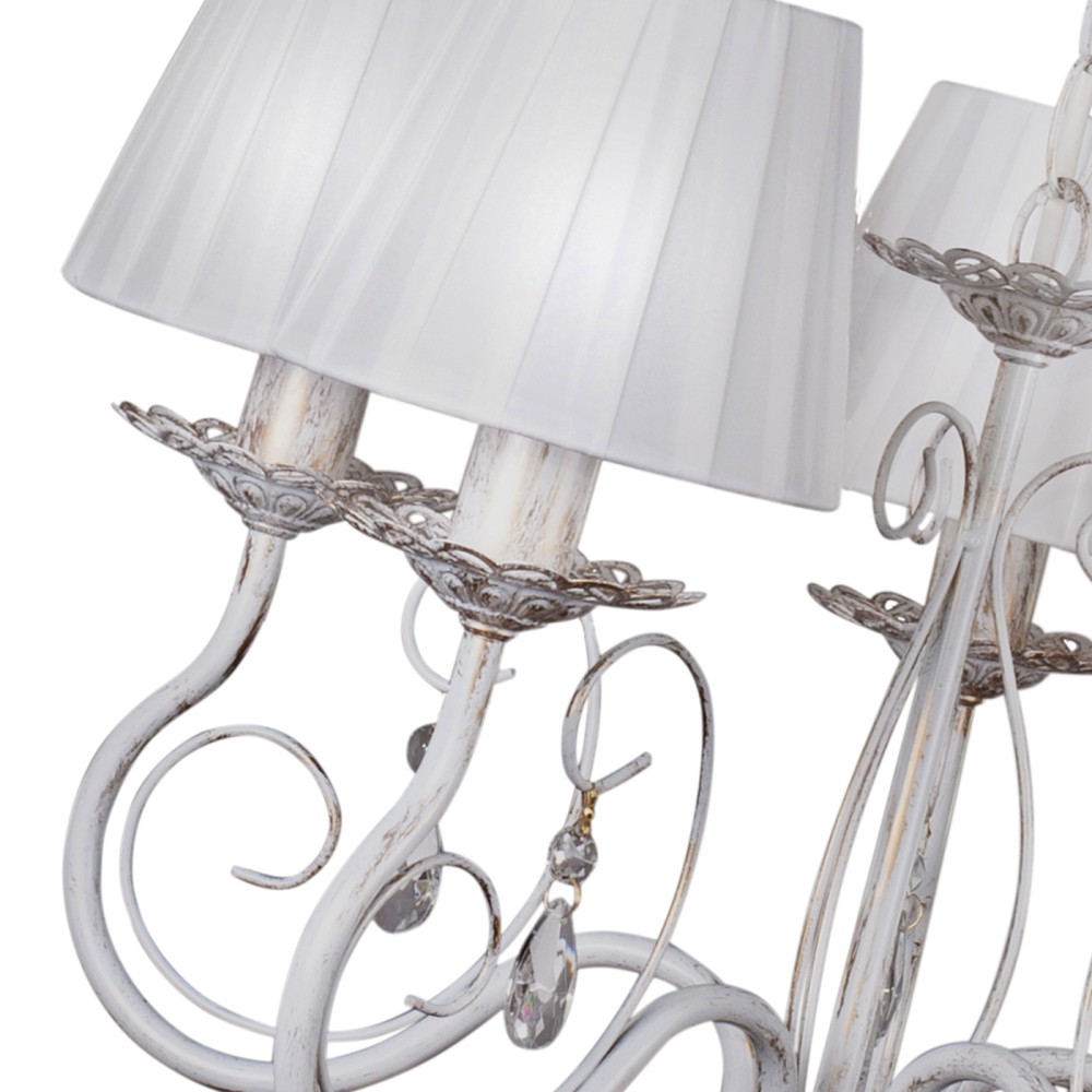 Абажуры из ткани, выполненные в классическом стиле, мягко рассеивают свет, создавая атмосферу уюта и тепла. Дополнительные хрустальные подвески добавляют светильнику изысканности и блеска, подчеркивая его роскошный вид. Размер основания составляет 12 см, что делает люстру достаточно компактной, чтобы она не перегружала пространство, но при этом обеспечивает достаточное количество света.