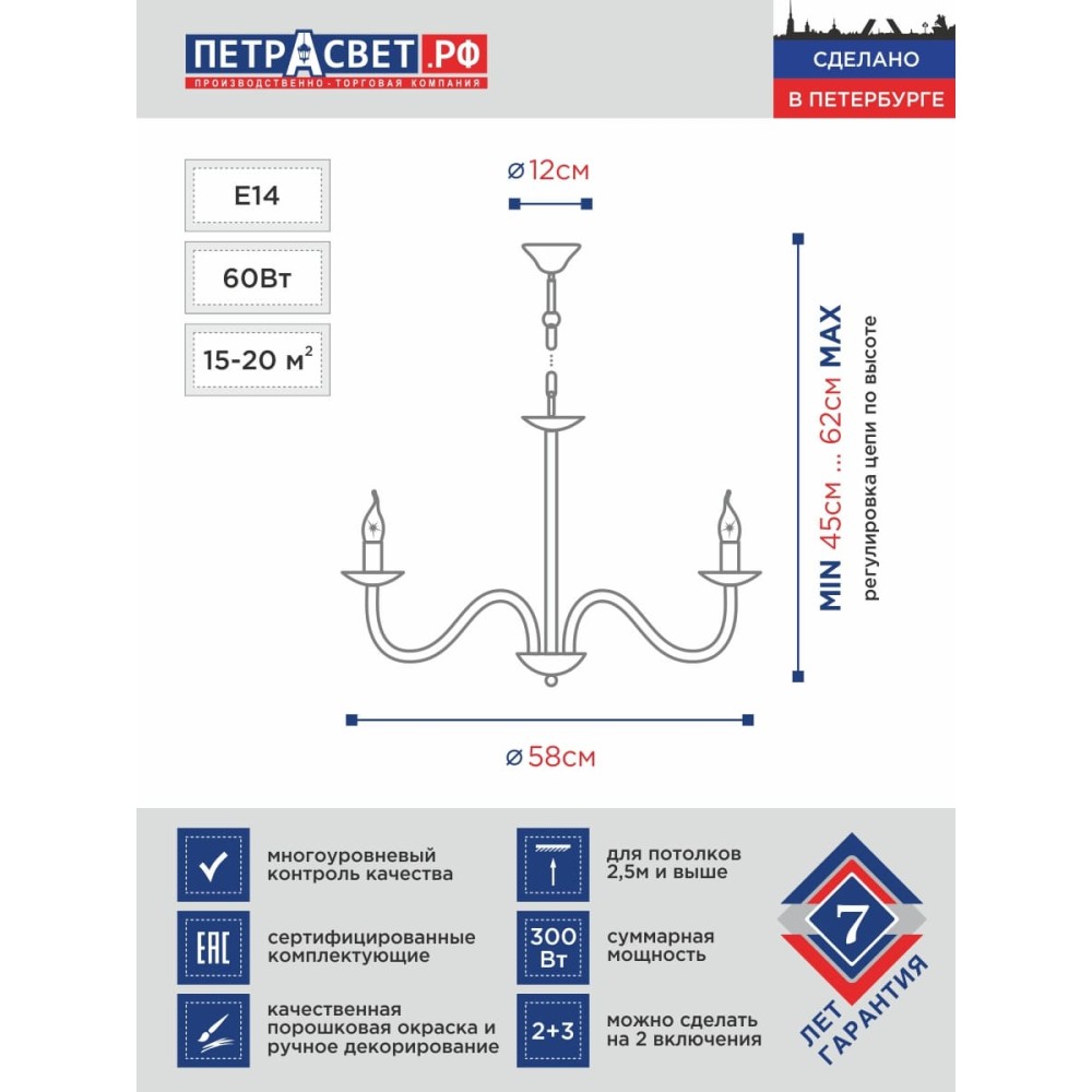 Люстра подвесная с хрусталем 5 ламп S1010-5 – это не просто осветительный прибор, это инвестиция в красоту и уют вашего дома. Она станет главным акцентом в интерьере, создавая атмосферу роскоши, элегантности и неповторимого шарма. Не упустите возможность преобразить свой дом с помощью этой великолепной люстры от бренда PETRASVET! Она идеально подойдет для создания романтической атмосферы в спальне, подчеркнет статус и вкус в гостиной, или станет центральным элементом в столовой, превращая трапезу в настоящее событие. Подарите себе и своим близким наслаждение от красивого и качественного освещения! Забудьте о серых буднях и создайте свой собственный мир, наполненный светом и красотой. Эта люстра – идеальный выбор для тех, кто ценит качество, стиль и комфорт. Приобретая люстру S1010-5, вы выбираете не просто освещение, а инвестицию в создание атмосферы, в которой хочется жить и радоваться каждому дню. Почувствуйте себя настоящим хозяином своего дома! Люстра подвесная 5 ламп российского производства ПЕТРАСВЕТ S1010-5, 5хЕ14 макс, 60Вт с хрустальными подвесками, цепь можно укоротить до 1 звена на 17 см, стиль - классика свечи, арматура - металл, цвет светильника- бежевый с патиной золота, размеры светильника (LxWxH) - 58x58x62, вес - 1,6 кг, Люстра на 2 включения, Люстра подвесная для натяжных потолков и освещение 15-20 м2 помещения в зависимости от мощности лампочек Е14, Люстра подвесная цепная 5 рожковая с хрусталем подходит для освещения комнат, кабинета, гостиной, спальни, столовой, детской, кухни, Заводская гарантия 7 лет, Люстра просто собирается, Люстры пяти рожковые собраны и проверены на производстве, плотно упакован в коробке из тройного гофра картона, Лампочки светодиодные LED подбираются по следующим параметрам: для яркого освещения - 3 Вт на 1 м2 комнаты, для среднего - 2 Вт на 1 м2,