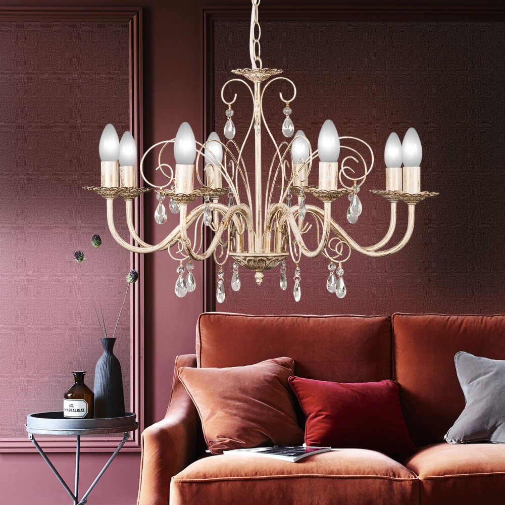 Люстра S1010-8 выполнен в стиле классики, неоклассики и прованса, что делает ее универсальной и подходящей для различных интерьерных решений. Восемь хрустальных подвесок, подвешенных к металлическому каркасу, создают потрясающий эффект мерцания и игры света. Хрусталь, благодаря своим превосходным светоотражающим свойствам, рассеивает свет, создавая мягкое и равномерное освещение. Декоративные элементы в виде хрустальных подвесок не только украшают светильник, но и подчеркивают его изысканность.