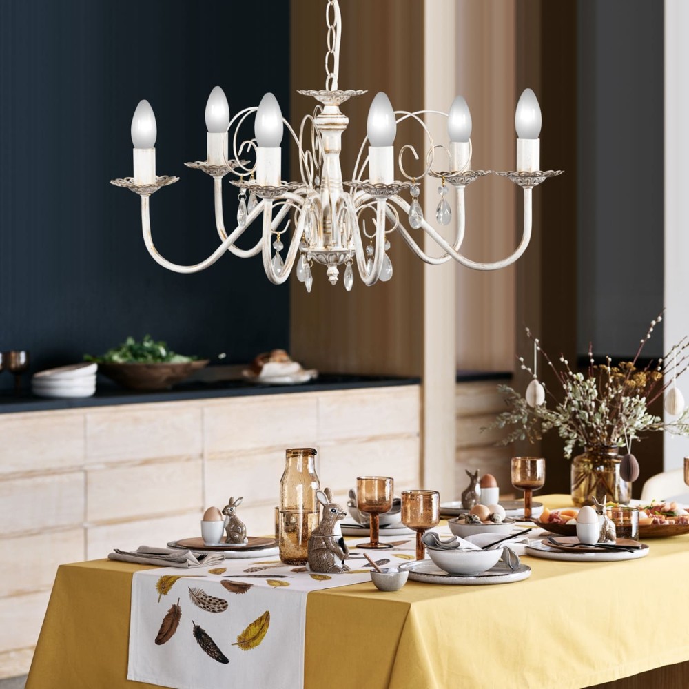 - 6 хрустальных подвесок: 6 хрустальных подвесок, подвешенных под углом, создают потрясающий визуальный эффект, преломляя свет и рассыпая его по всему помещению. Эти хрустальные элементы не только украшают светильник, но и улучшают освещение, делая его более равномерным и комфортным.