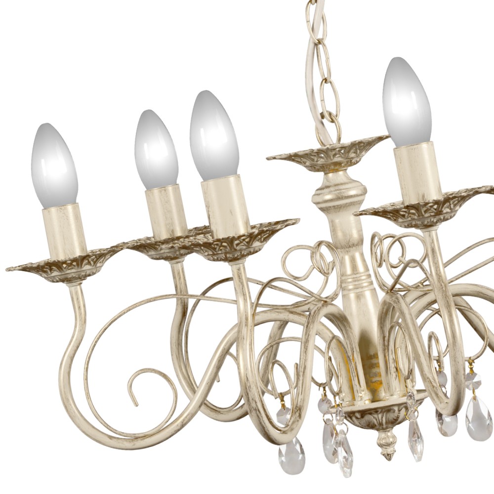 - Металл: Корпус люстры выполнен из прочного и долговечного металла, окрашенного в элегантном бежевом цвете с патиной золота. Эта комбинация создает ощущение тепла и уюта, а также подчеркивает роскошный вид хрустальных подвесок.