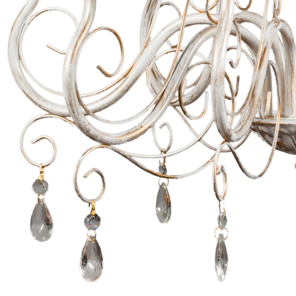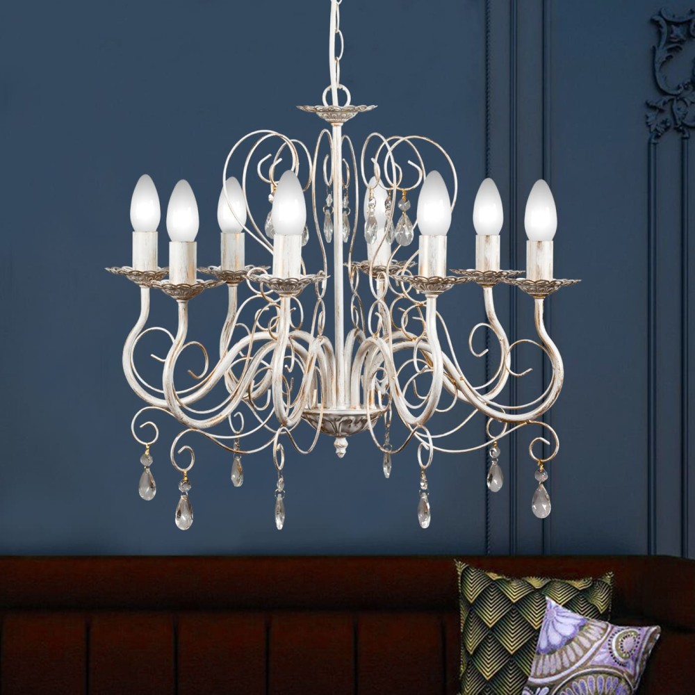 Люстра подвесная 8 ламп российского производства ПЕТРАСВЕТ S1021-8, 8хЕ14 макс, 60Вт с хрустальными подвесками, цепь можно укоротить до 1 звена на 17 см, стиль - классика свечи, арматура - металл, цвет светильника- белый с патиной золота, размеры светильника (LxWxH) - 60x60x66, вес - 2,3 кг, Люстра на 2 включения, Люстра подвесная для натяжных потолков и освещение 24-32 м2 помещения в зависимости от мощности лампочек Е14, Люстра подвесная цепная 8 рожковая с хрусталем подходит для освещения комнат, кабинета, гостиной, спальни, столовой, детской, кухни, Заводская гарантия 7 лет, Люстра просто собирается, Подвесной светильник на 8 лампочек собран и проверен на производстве, плотно упакован в коробке из тройного гофра картона, Лампочки светодиодные LED подбираются по следующим параметрам: для яркого освещения - 3 Вт на 1 м2 комнаты, для среднего - 2 Вт на 1 м2,