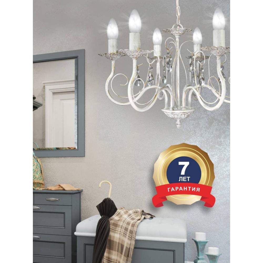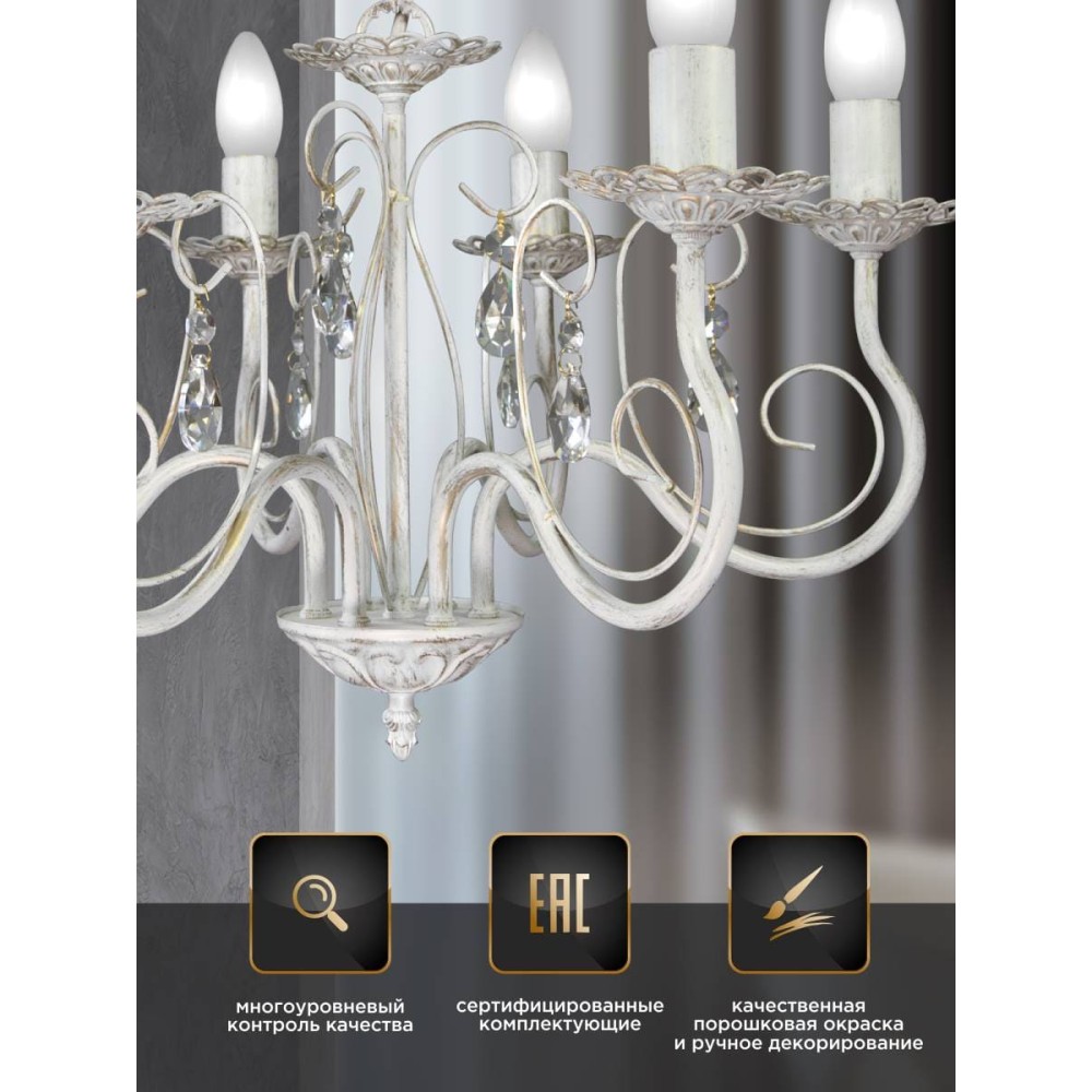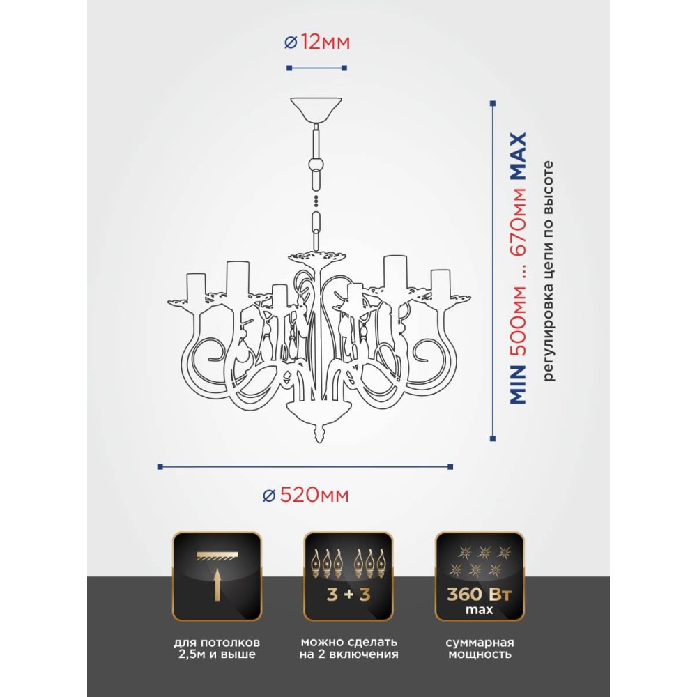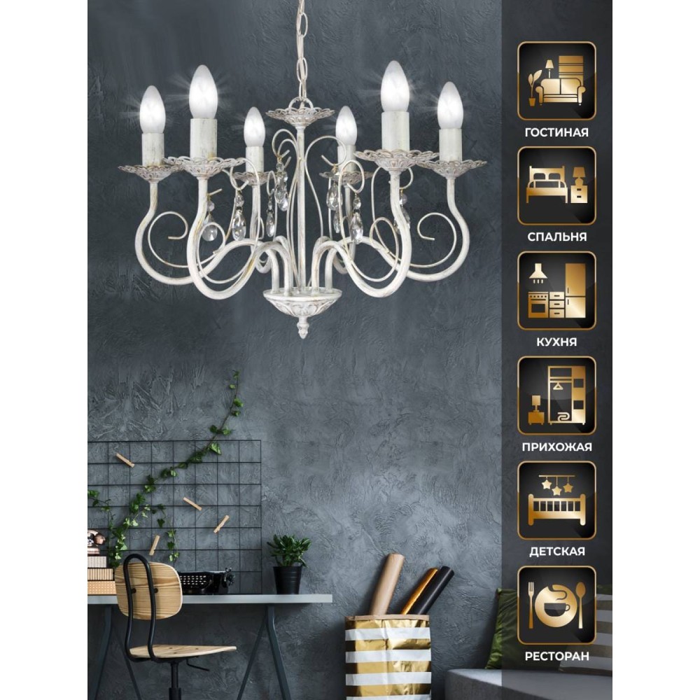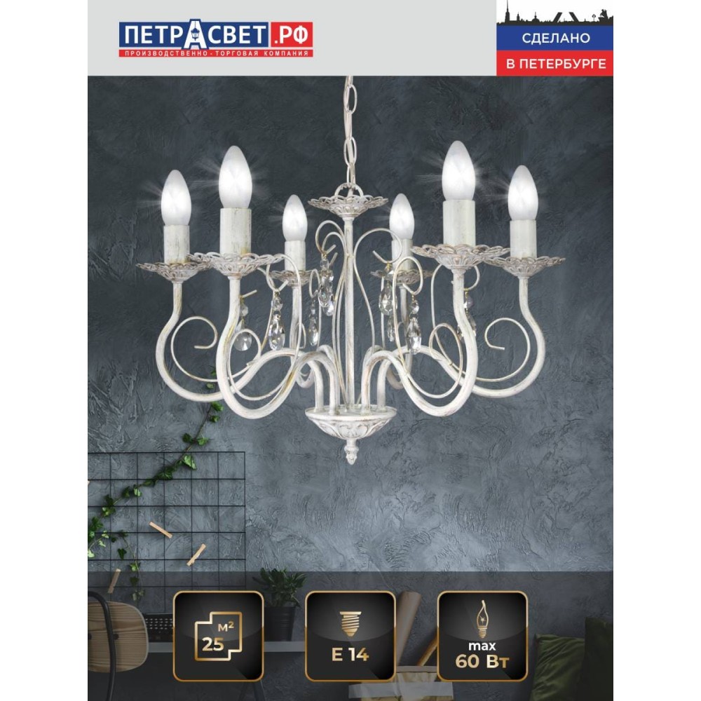 Люстра подвесная 6 ламп хрусталь белая российского производства ПЕТРАСВЕТ S1035-6, 6хЕ14 макс, 60Вт с хрустальными подвесками, цепь можно укоротить до 1 звена на 17 см, стиль - классика свечи, арматура - металл, цвет светильника- белый с патиной золота, размеры светильника (LxWxH) - 62x62x62, вес - 1,6 кг, Люстра на 2 включения, Люстра подвесная для натяжных потолков и освещение 18-24 м2 помещения в зависимости от мощности лампочек Е14, Люстра подвесная цепная 6 рожковая для девочки в комнату подходит для освещения кабинета, гостиной, спальни, столовой, зала, кухни, Заводская гарантия 7 лет, Люстра просто собирается, Подвесной светильник детский для девочки собран и проверен на производстве, плотно упакован в коробке из тройного гофра картона, Лампочки светодиодные LED подбираются по следующим параметрам: для яркого освещения - 3 Вт на 1 м2 комнаты, для среднего - 2 Вт на 1 м2,