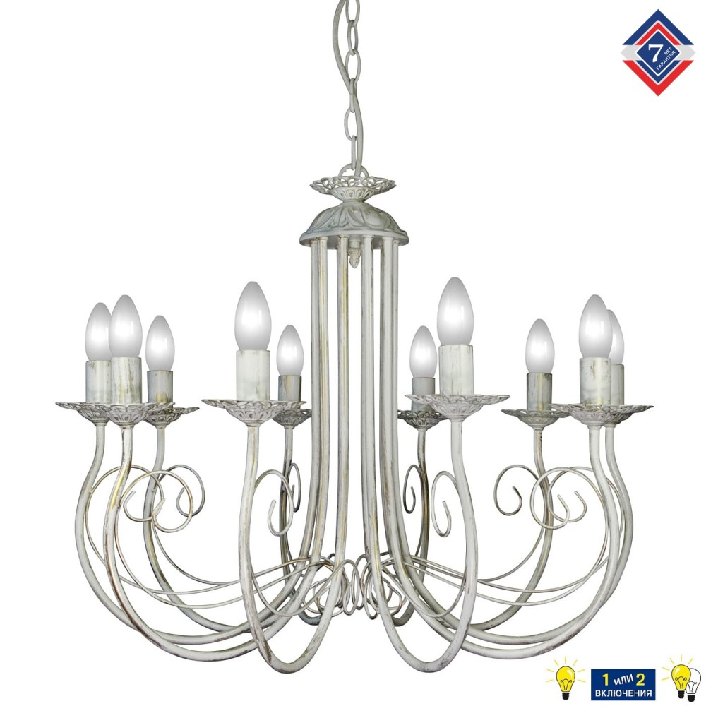 - Количество ламп: 10 – обеспечивает равномерное и яркое освещение. Благодаря большому количеству ламп, люстра способна эффективно освещать большие площади.