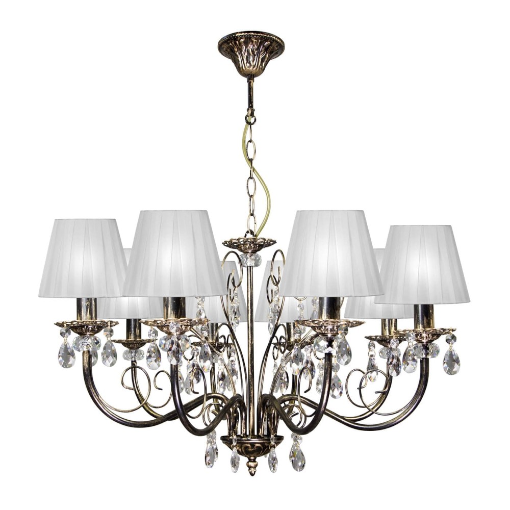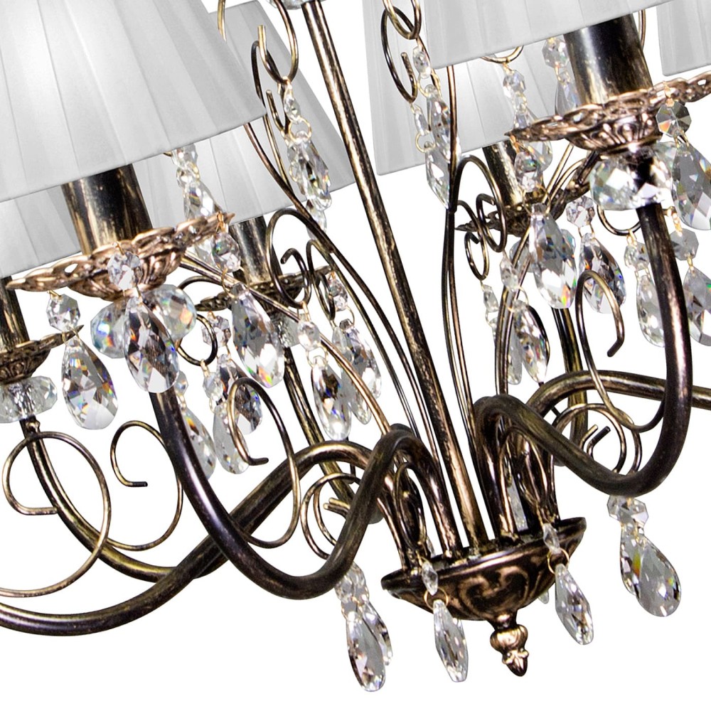 - Материалы и Дизайн: Люстра изготовлена из прочного и долговечного металла, покрытого эффектной патиной золота, что придает ей глубину и насыщенность. Тканевый плафон, обитый высококачественной тканью, обеспечивает мягкое и рассеянное освещение, создавая атмосферу тепла и уюта. Хрустальные подвески, хрустальные вставки и изысканные абажуры добавляют блеска и роскоши, превращая люстру в яркий акцент интерьера.
