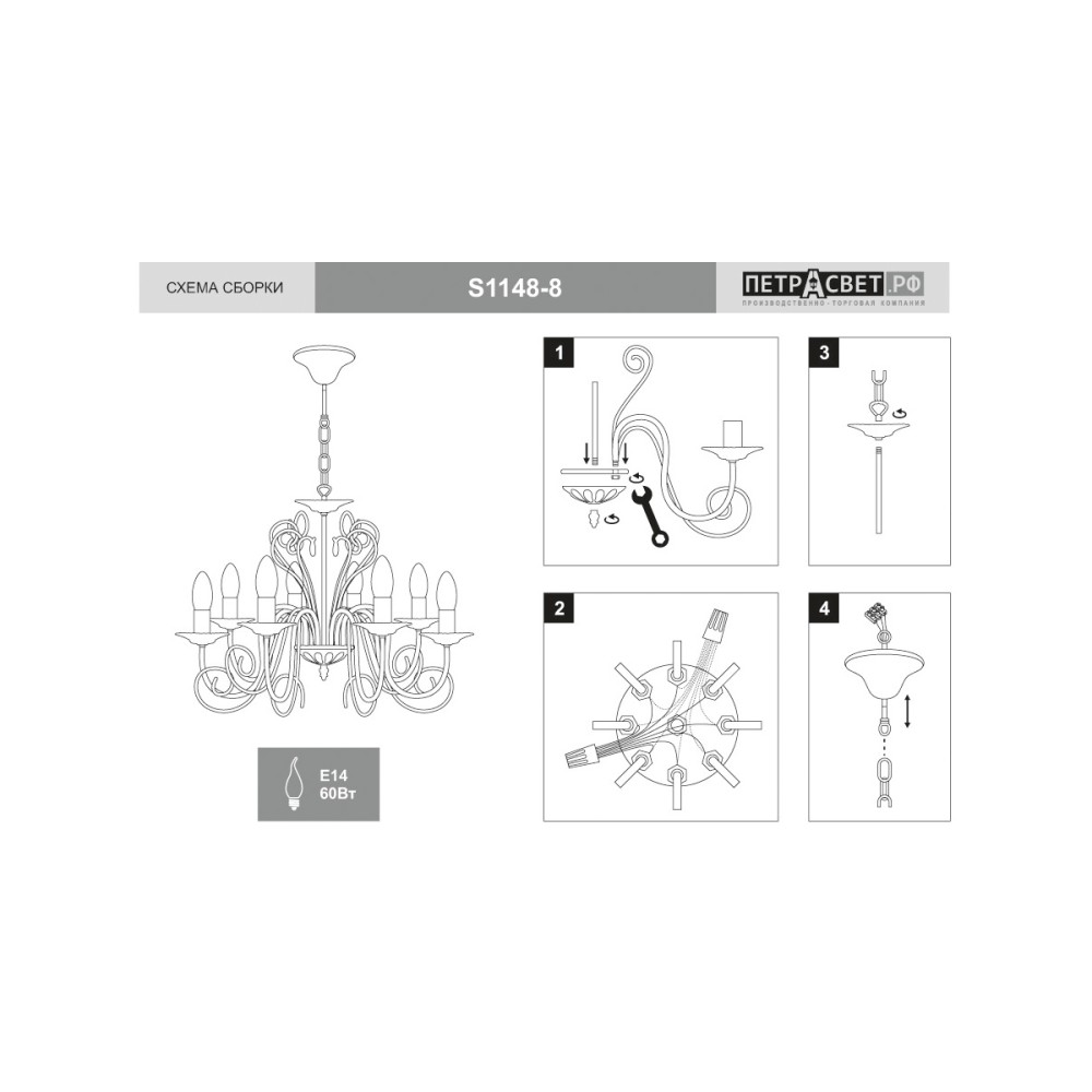 - Количество ламп: 8 ламп S1148 (тип цоколя Е14). Это оптимальное количество ламп для создания равномерного и достаточно яркого освещения.