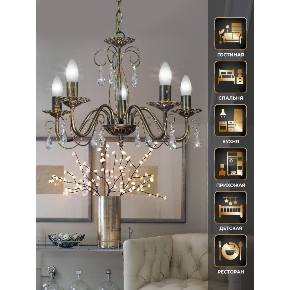 - Роскошное хрустальное сияние: Пять хрустальных подвесок создают потрясающий эффект рассеянного света.