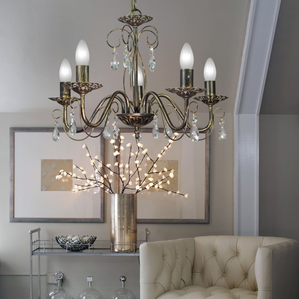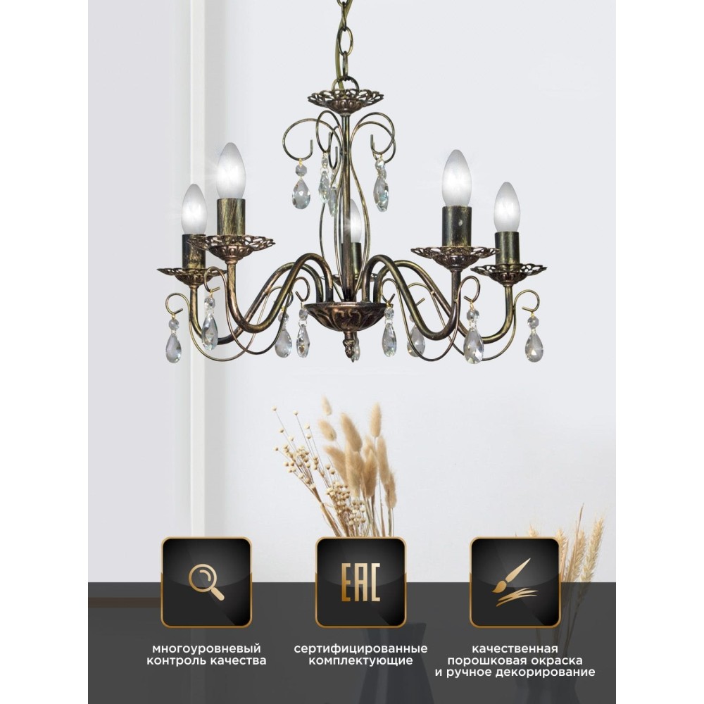 Главной особенностью этой люстры являются пять великолепных хрустальных подвесок, которые создают потрясающий эффект рассеянного света. Эти хрустальные элементы не только добавляют эстетическую привлекательность, но и эффективно распределяют свет, делая пространство более комфортным и уютным. Хрусталь, используемый в изготовлении подвесок, отличается высокой прозрачностью и превосходными светоотражающими свойствами, что обеспечивает яркое и равномерное освещение. Вы можете выбрать подходящий тип ламп – накаливания, светодиодные или люминисцентные – для достижения желаемого цветового тона и яркости.