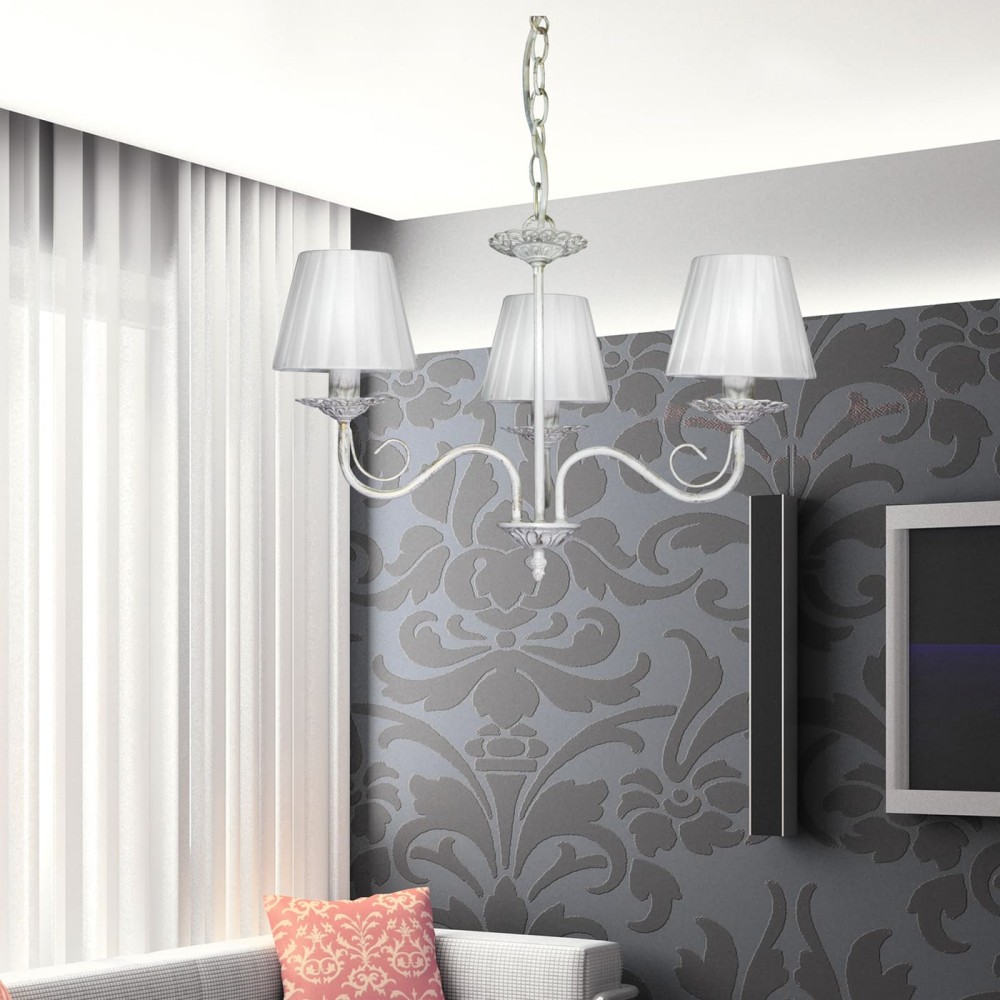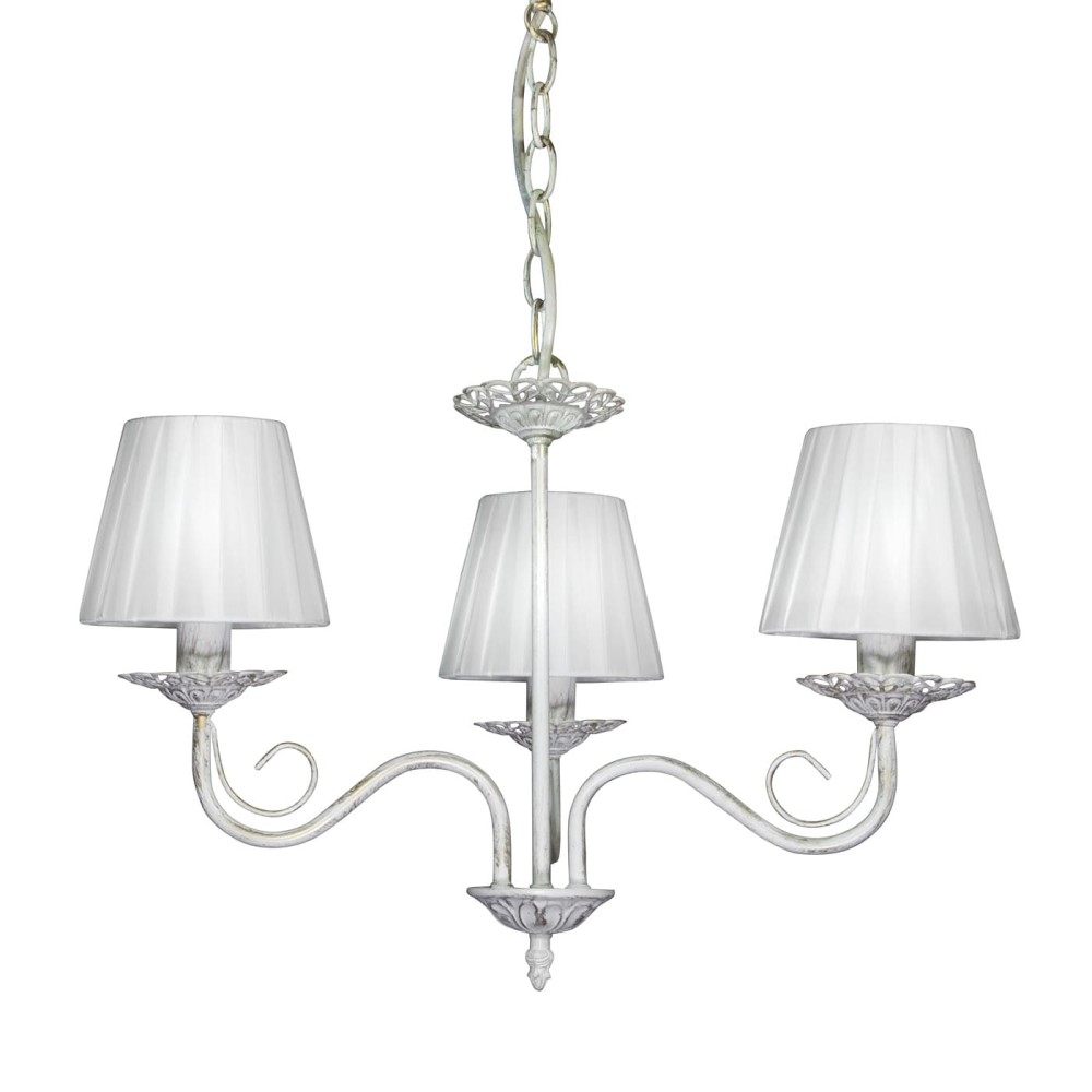 Корпус люстры выполнен из прочного металла, покрытого патиной золота, что придает ей благородный и изысканный вид. Материал плафона – ткань, обеспечивающая мягкое рассеивание света и дополнительный элемент декора. Белый цвет абажуров подчеркивает красоту металла и создает ощущение чистоты и свежести. Использование качественных материалов гарантирует долговечность и надежность люстры.