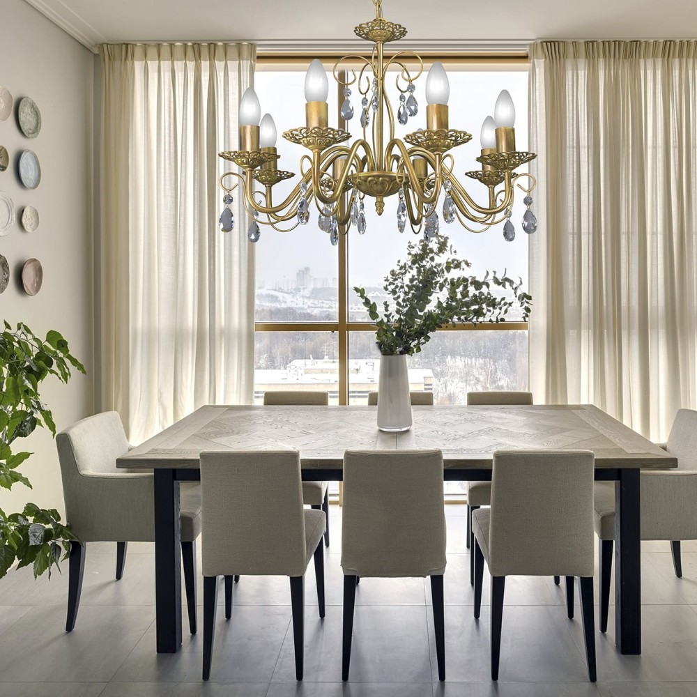 Люстра Аврора S1195-8 выполнена из высококачественного металла, покрытого патиной золота, что придает ей благородный и теплый оттенок. Использование металла не только обеспечивает долговечность светильника, но и создает эффект мерцающего света, подчеркивая его роскошный вид. Хрустальные подвески, являющиеся ключевым декоративным элементом, добавляют люстре неповторимый шарм и играют бликами света, создавая завораживающий эффект. Ширина основания люстры составляет 12 см, а высота – 51-68 см, что позволяет ей гармонично вписаться в интерьеры различных помещений.