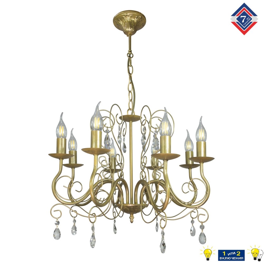 Люстра S1197-8 изготовлена из высококачественного металла с патиной золота, что придает ей неповторимый блеск и глубину. Матовая отделка металла не только выглядит роскошно, но и обеспечивает долговечность светильника. Произведенная в России, люстра соответствует всем российским стандартам качества и безопасности. Срок гарантии 7 лет – это уверенность в надежности и долговечности вашей покупки.