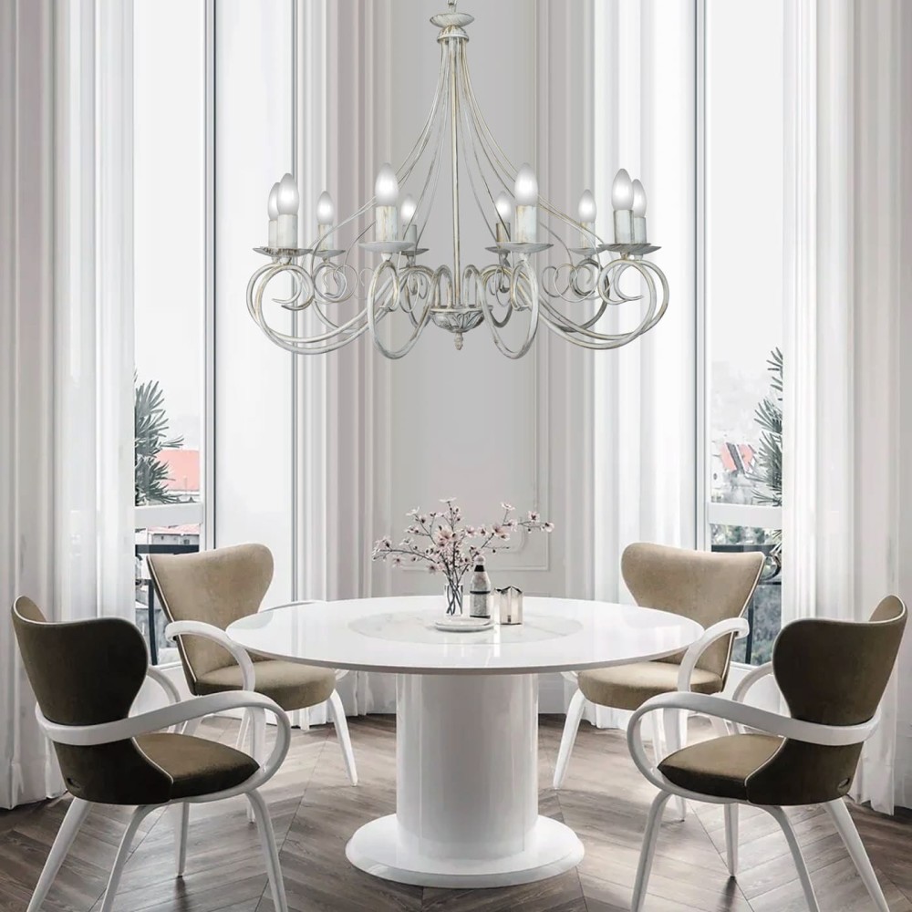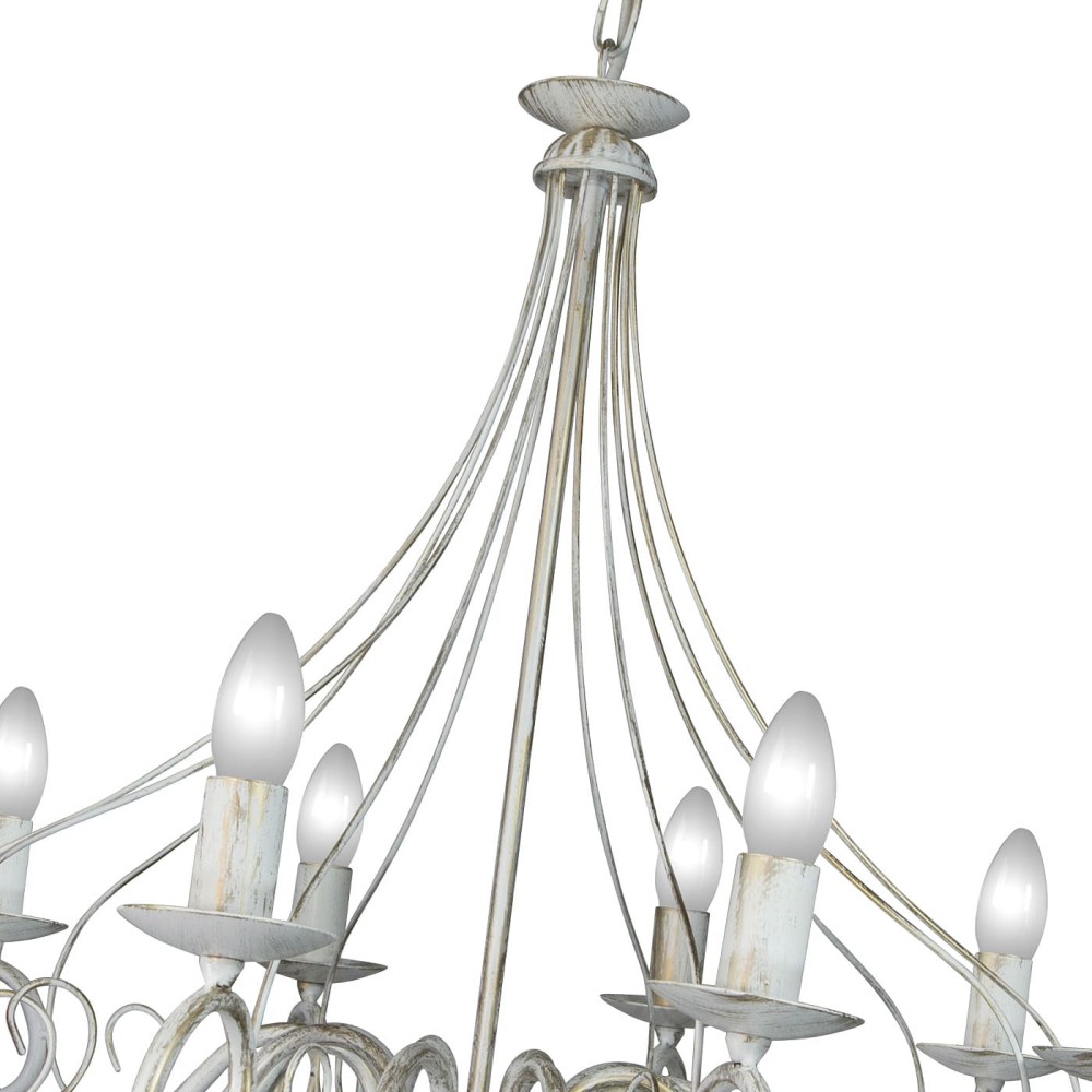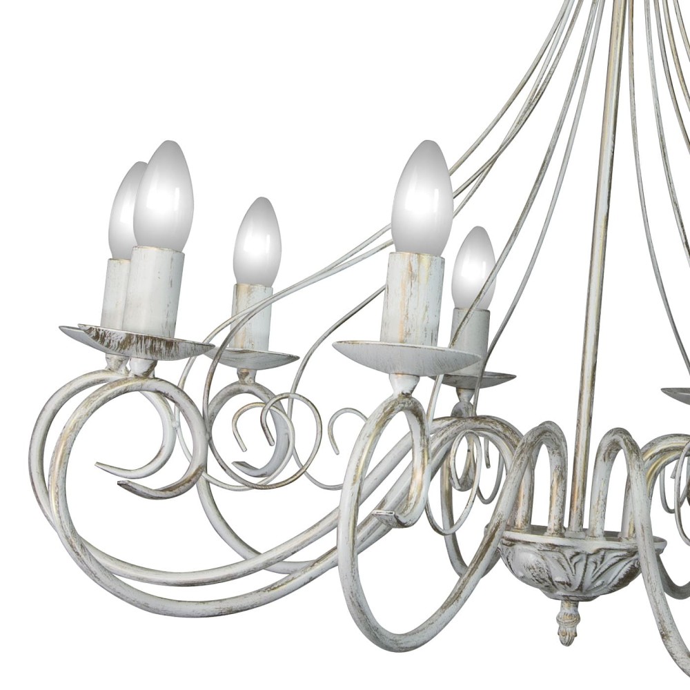 Люстра выполнена из высококачественного металла, покрытого патиной золота, что придает ей благородный и винтажный вид. Белый цвет основания и плафона подчеркивает элегантность изделия и гармонично вписывается в различные стили интерьера. Благодаря продуманному дизайну, люстра выглядит эффектно и солидно, идеально подходя для гостиной, столовой, спальни или холла.