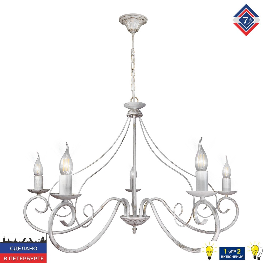 Ключевые слова для SEO: люстра, подвесная люстра, интерьерная люстра, ПЕТРАСВЕТ, классическая люстра, неоклассическая люстра, прованс люстра, люстра с патиной золота, люстра с 5 лампами, люстра Е14, люстра 220В, российская люстра, люстра с гарантией, светодиодная люстра, люстра накаливания, люстра люминисцентная, элегантная люстра, роскошная люстра, подвесная люстра купить, купить люстру, светильник, освещение, интерьер, дизайн интерьера. Люстра подвесная большая 5 ламп в зал российского производства ПЕТРАСВЕТ S1202-5, 5хЕ14 макс, 60Вт, цепь можно укоротить до 1 звена на 17 см, стиль - классика свечи, арматура - металл, цвет светильника- белый с патиной золота, размеры светильника (LxWxH) - 85x85x85, вес - 3,1 кг, Люстра на 2 включения, Люстра подвесная и для натяжных потолков и освещение 20-25 м2 помещения в зависимости от мощности лампочек Е14, Люстра подвесная цепная 5 рожковая подходит для освещения комнат, кабинета, гостиной, спальни, столовой, детской, кухни, Заводская гарантия 7 лет, Люстра просто собирается, Подвесной светильник на 5 лампочек проверен на производстве, плотно упакован в коробке из тройного гофра картона, Упаковка выдерживает и гарантирует сохранность содержимого при падении на дно и ребро коробки с высоты 110 см, Лампочки светодиодные LED подбираются по следующим параметрам: для яркого освещения - 3 Вт на 1 м2 комнаты, для среднего - 2 Вт на 1 м2, В случае боя или не комплекта, свяжитесь с нами мы вышлем Вам новый в день обращения,