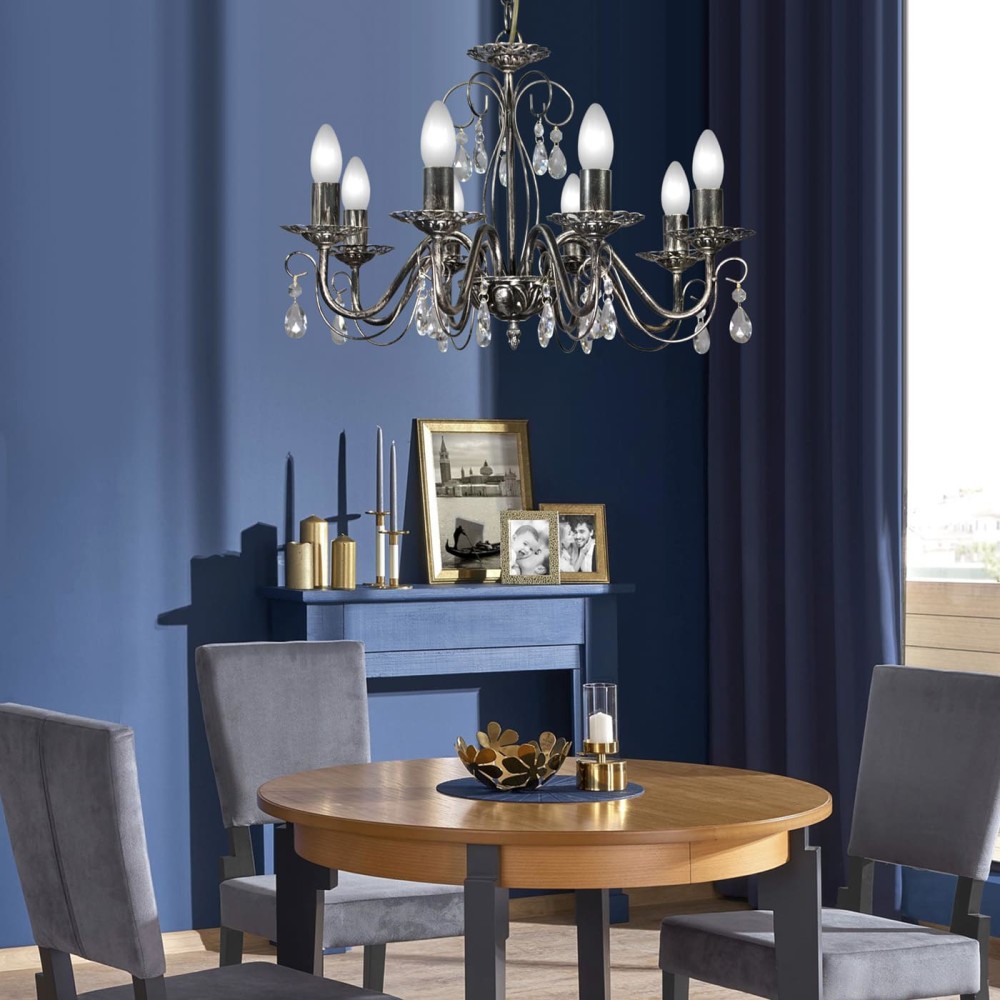 - Роскошный дизайн: Люстра Аврора воплощает в себе дух классики и неоклассики. Использование металла, обработанного патиной серебра, придает ей благородный и утонченный вид. Сочетание черного цвета с патиной серебра создает эффектный контраст, который подчеркивает красоту хрустальных подвесок.