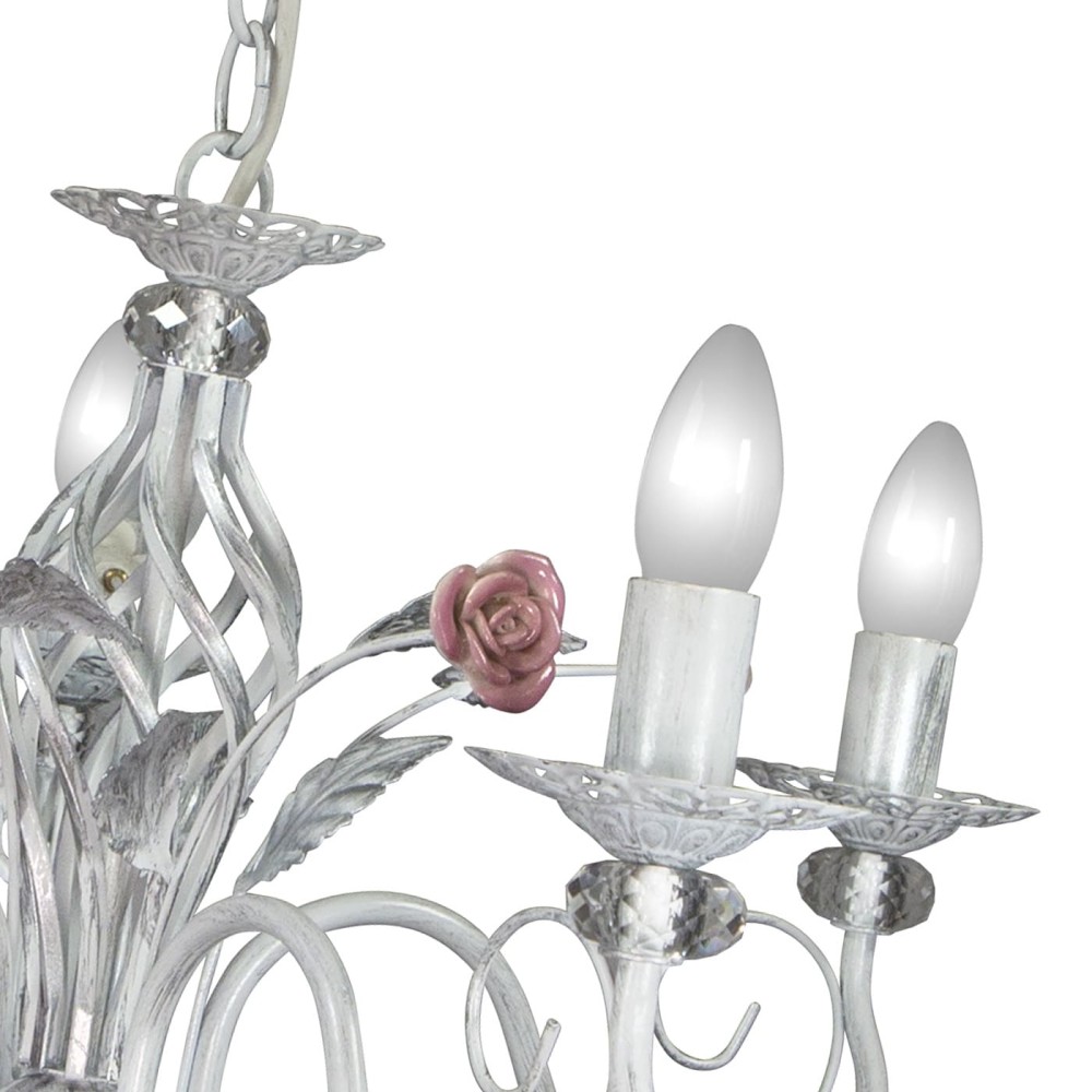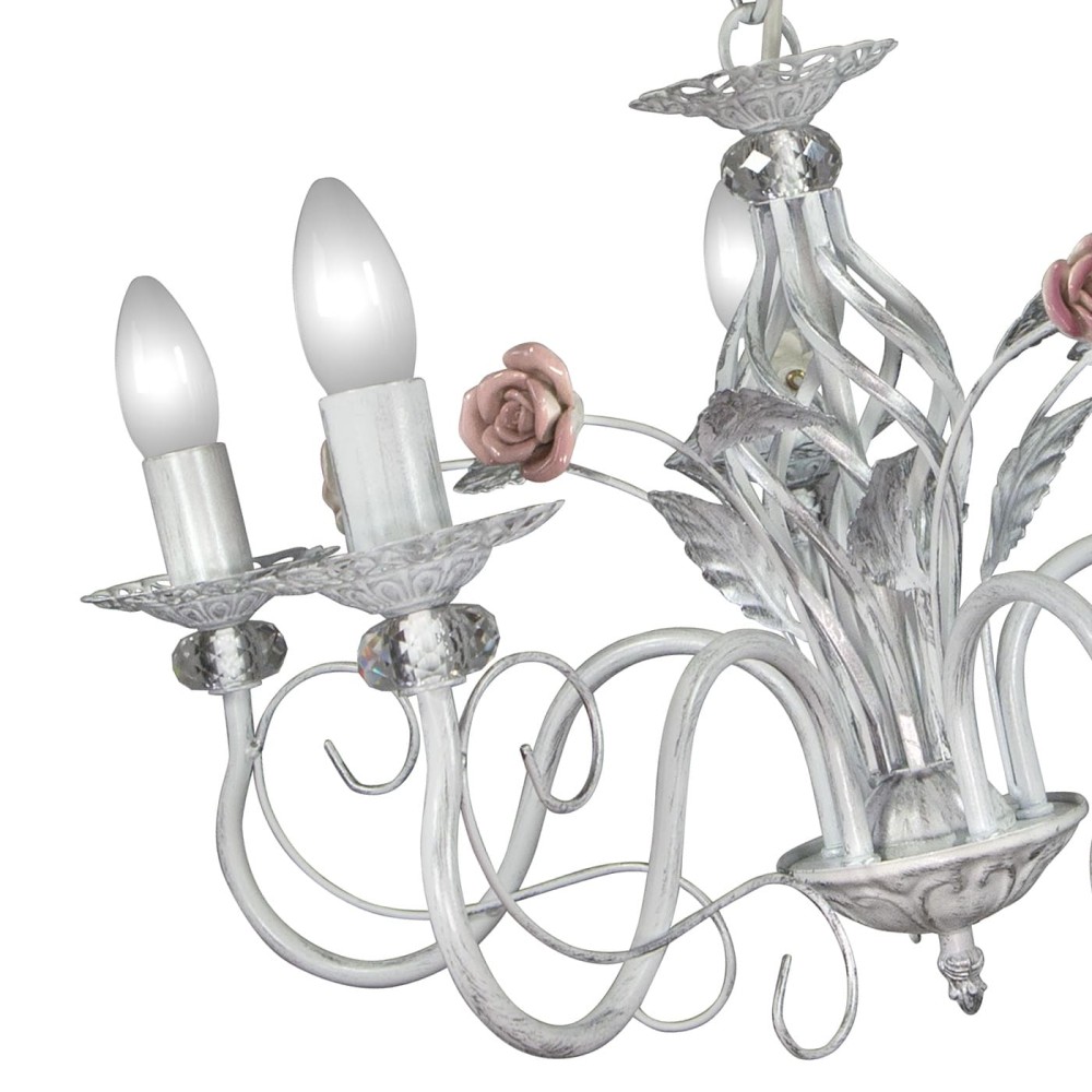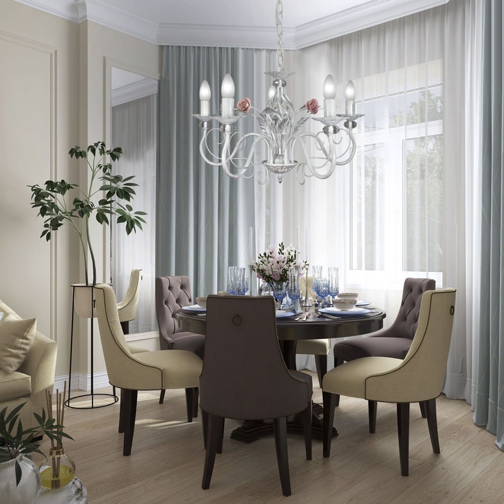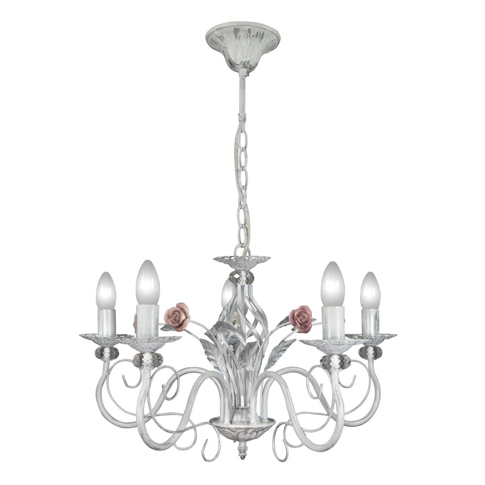 Люстра S1017-5 – это не просто источник света, это произведение искусства. Ее дизайн воплощает в себе гармоничное сочетание стилей: флористики, классики и современности. Розовые розы, выполненные из хрустальных вставок, придают люстре нежный и романтичный вид, а патинированное серебро металла подчеркивает ее благородство и долговечность. Изящные цветочные элементы, аккуратно вплетенные в конструкцию, создают ощущение тепла и уюта, наполняя помещение мягким и рассеянным светом.