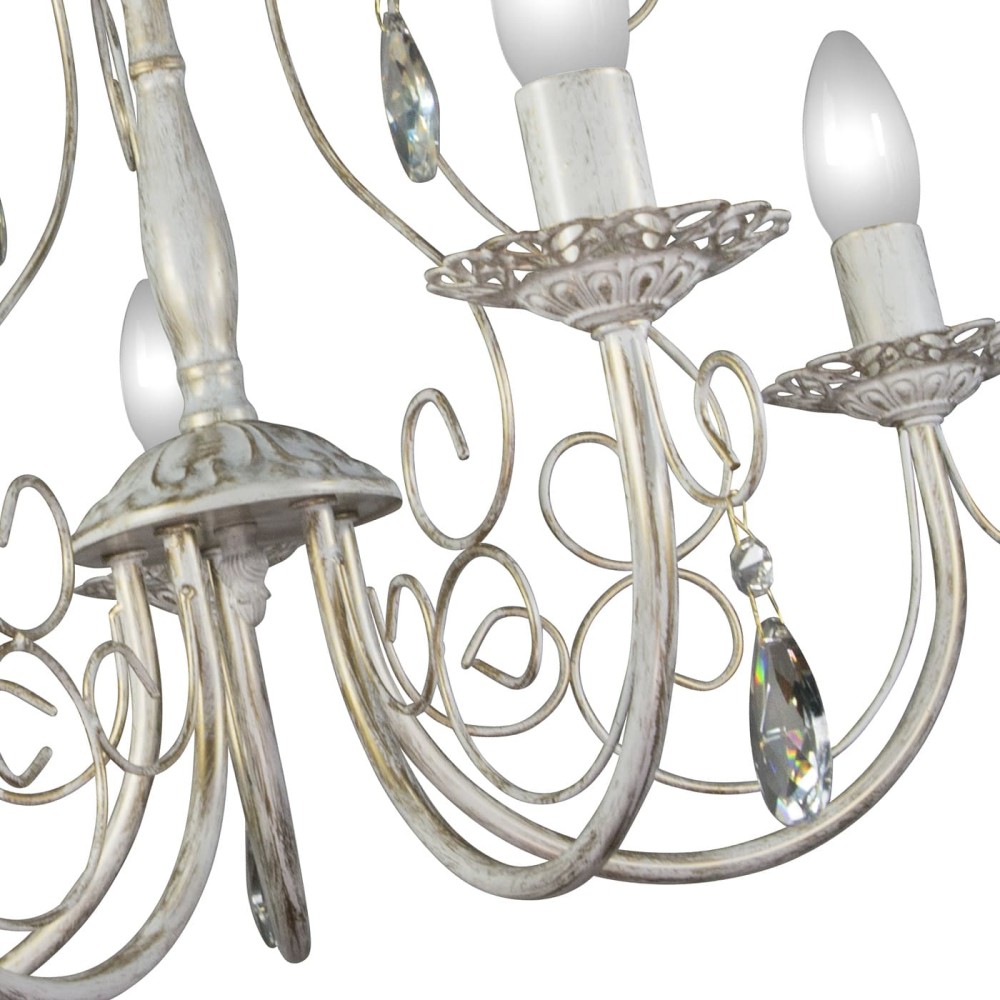 Люстра S1211-5 выполнена из металла с патиной золота, что придает ей неповторимый, теплый оттенок. Белая отделка плафона и хрустальных подвесок создает контраст, подчеркивающий красоту каждой детали. Использование патины золота придает светильнику винтажный шарм, идеально вписывающийся в стили неоклассика, прованс и классический интерьер. Хрустальные подвески не только украшают люстру, но и рассеивают свет, создавая мягкое, рассеянное освещение.