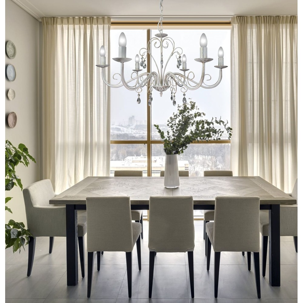 - Роскошный дизайн: Люстра выполнена в классическом стиле с элементами неоклассики и прованса, что обеспечивает ей универсальность и гармонию с различными интерьерными решениями. Белый цвет светильника с патиной золота создает мягкое, теплое свечение, подчеркивая красоту хрустальных подвесок и металла. Использование патины придает светильнику винтажный вид, добавляя ему шарма и индивидуальности.