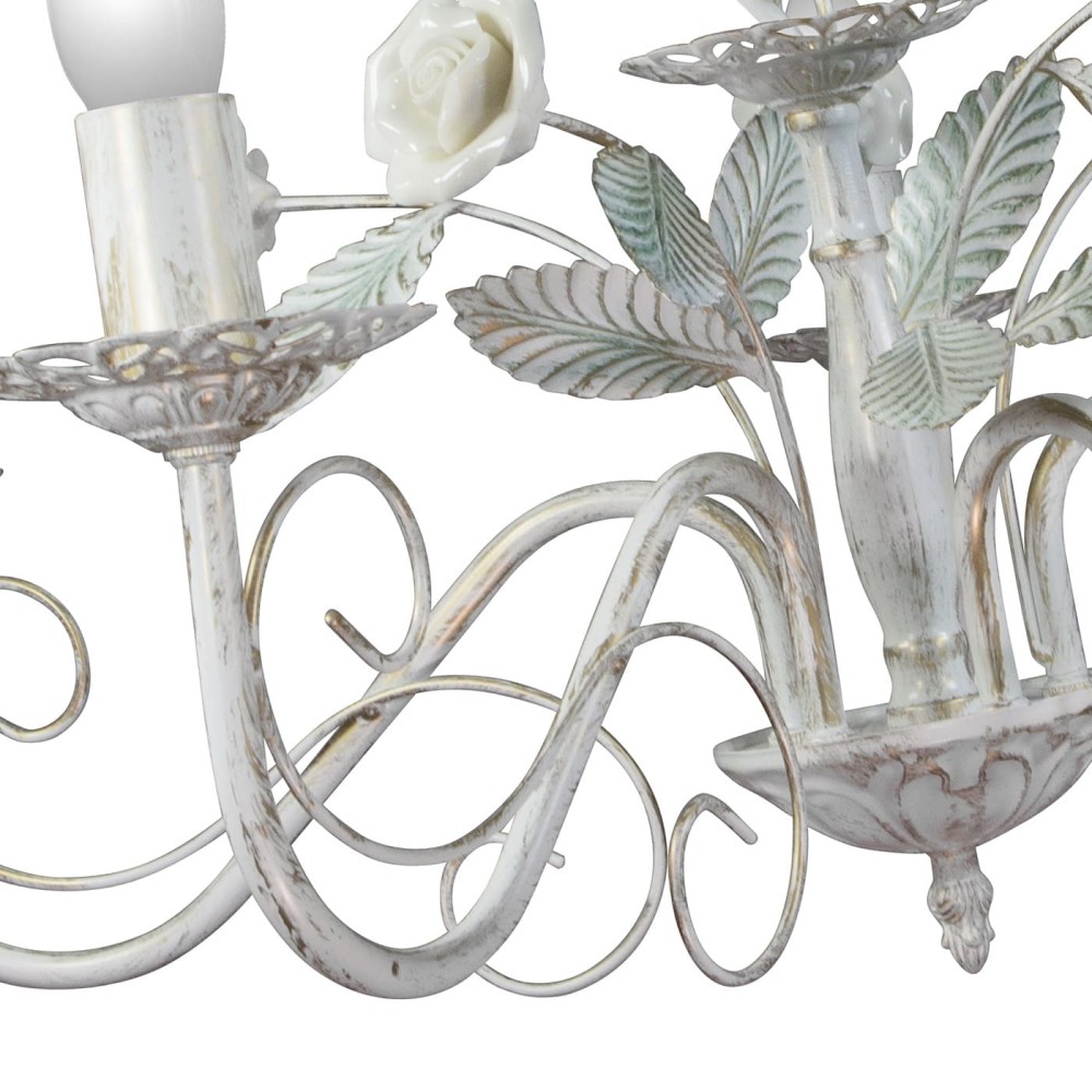 - Роскошный дизайн: Изысканное сочетание белого металла с патиной золота и флористических элементов делает эту люстру настоящим произведением искусства.