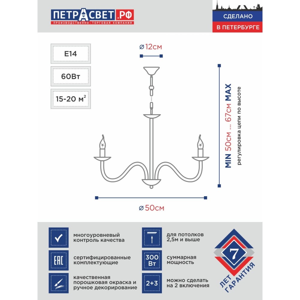 Подвесная люстра S1225-5 – это не просто источник света, это инвестиция в красоту и комфорт вашего дома. Ее изысканный дизайн, высокое качество и надежность гарантируют долгие годы безупречного освещения. Выбирая эту люстру, вы выбираете стиль, элегантность и комфорт для себя и своих близких. Забудьте о скучном и безликом освещении – превратите свой дом в оазис стиля и уюта с люстрой S1225-5 от PETRASVET. Эта люстра станет настоящим украшением вашего интерьера и подчеркнет вашу индивидуальность. Закажите ее прямо сейчас и наслаждайтесь прекрасным освещением! Люстра подвесная 5 рожковая прованс российского производства ПЕТРАСВЕТ S1225-5, 5хЕ14 макс, 60Вт, цепь можно укоротить до 1 звена на 17 см, стиль - классика свечи, арматура - металл, цвет светильника- белый с патиной золота, размеры светильника (LxWxH) - 50x50x67, вес - 1,5 кг, Люстра на 2 включения, Люстра подвесная и для натяжных потолков и освещение 15-20 м2 помещения в зависимости от мощности лампочек Е14, Люстра подвесная цепная 5 рожковая подходит для освещения комнат, кабинета, гостиной, спальни, столовой, детской, кухни, Заводская гарантия 7 лет, Люстра просто собирается, Люстры пяти рожковые произведены и проверены на производстве, плотно упакован в коробке из тройного гофра картона, Лампочки светодиодные LED подбираются по следующим параметрам: для яркого освещения - 3 Вт на 1 м2 комнаты, для среднего - 2 Вт на 1 м2,