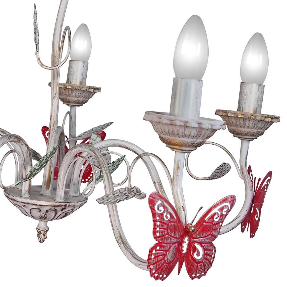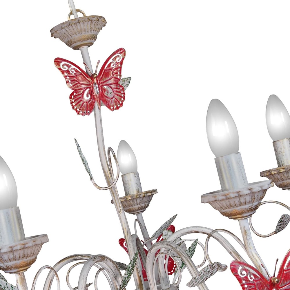 Основной особенностью люстры являются декоративные элементы в виде бабочек и листьев, выполненных из металла. Они придают светильнику неповторимый и романтичный вид, создавая атмосферу волшебства и нежности. Детализация этих элементов подчеркивает мастерство дизайнеров и ручной труд, которым славится российское производство. Изящные бабочки и листья, выполненные в патине золота, гармонично сочетаются с белым цветом светильника, создавая эффектный контраст и привлекают внимание.