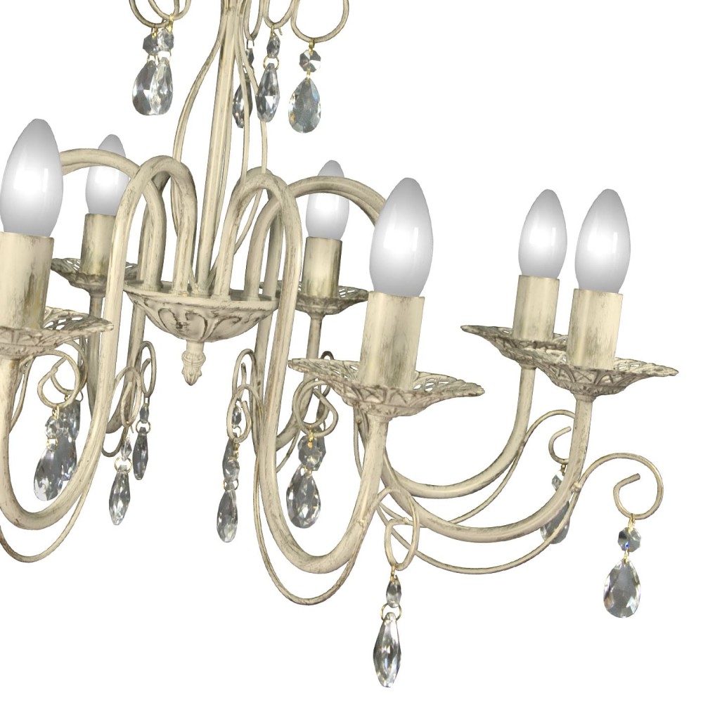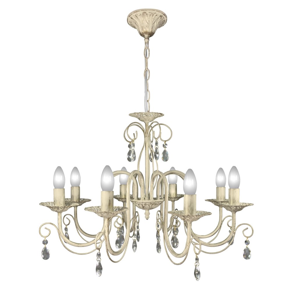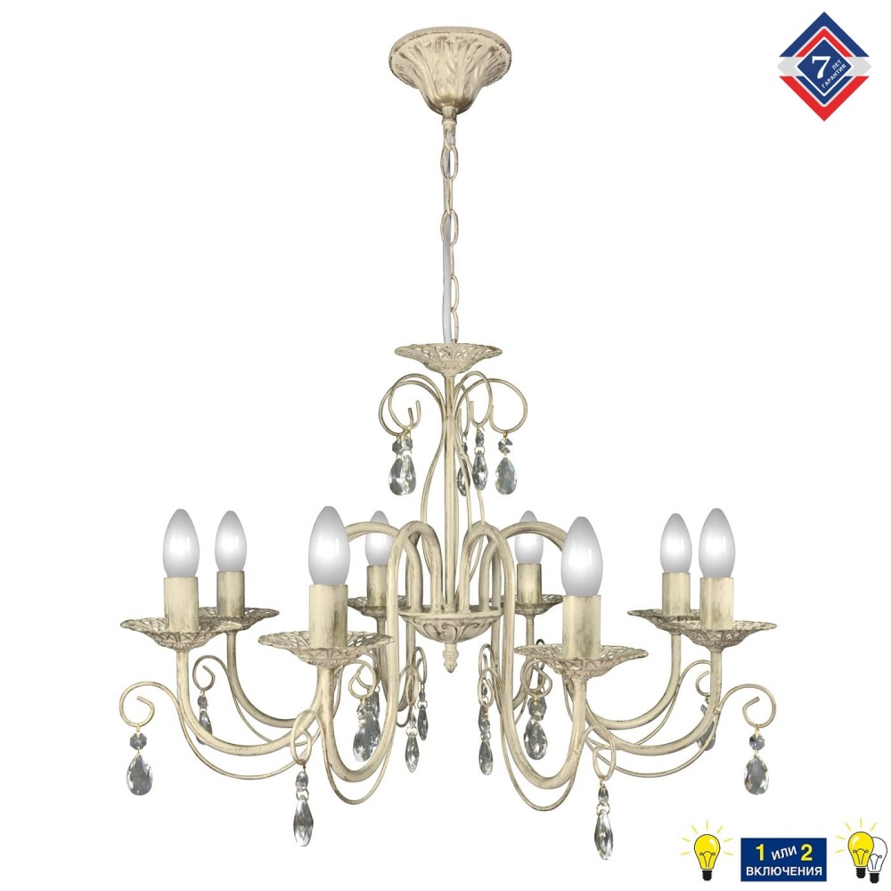 - Хрустальные подвески: Восемь изящных хрустальных подвесок, расположенных на металлическом каркасе, отражают и преломляют свет, создавая волшебный, мерцающий эффект. Каждый кристалл тщательно отполирован, чтобы обеспечить максимальную прозрачность и блеск.