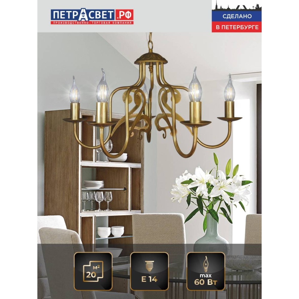 Люстра подвесная 5 ламп Аврора от Петрасвет – это не просто светильник, а настоящее произведение искусства, которое преобразит ваш интерьер и создаст атмосферу роскоши и уюта. Инвестируйте в качество и стиль, и вы не пожалеете! Эта люстра станет украшением вашего дома на долгие годы. Почувствуйте себя настоящим хозяином роскоши с люстрой Аврора! Позвольте себе наслаждаться красотой и элегантностью этого великолепного светильника. Люстра подвесная цепная 5 свечи золотая российского производства ПЕТРАСВЕТ S1264-5, 5хЕ14 макс, 60Вт с лазерной резкой, цепь можно укоротить до 1 звена на 17 см, стиль -нео классика свечи, арматура - металл, цвет светильника- золото с патиной золота, размеры светильника (LxWxH) -60x60x66, вес - 2 кг, Люстра на 2 включения, Люстра подвесная и для натяжных потолков и освещение 15-20 м2 помещения в зависимости от мощности лампочек Е14, Люстра подвесная цепная 5 рожковая подходит для освещения комнат, кабинета, гостиной, спальни, столовой, детской, кухни, Заводская гарантия 7 лет, Люстра просто собирается, Люстра просто собирается по инструкции, Люстры пяти рожковые собраны и проверены на производстве, плотно упакован в коробке из тройного гофра картона, Упаковка выдерживает и гарантирует сохранность содержимого при падении на дно и ребро коробки с высоты 110 см, Лампочки светодиодные LED подбираются по следующим параметрам: для яркого освещения - 3 Вт на 1 м2 комнаты, для среднего - 2 Вт на 1 м2, В случае боя или не комплекта, вышлем новы за свой счет в день обращения,