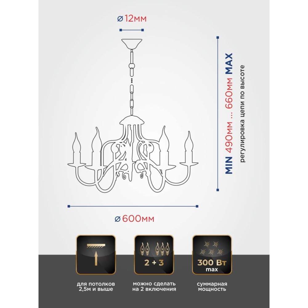 - Высота: 49-66 см – позволяет регулировать высоту подвеса люстры, адаптируя ее под высоту потолка в вашем доме.