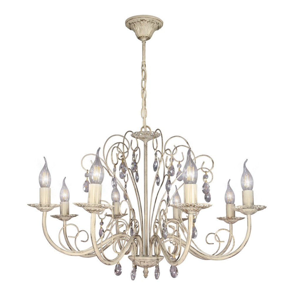 - Декоративные элементы: 8 хрустальных подвесок, которые являются главным украшением люстры, играют бликами света и создают ощущение роскоши.