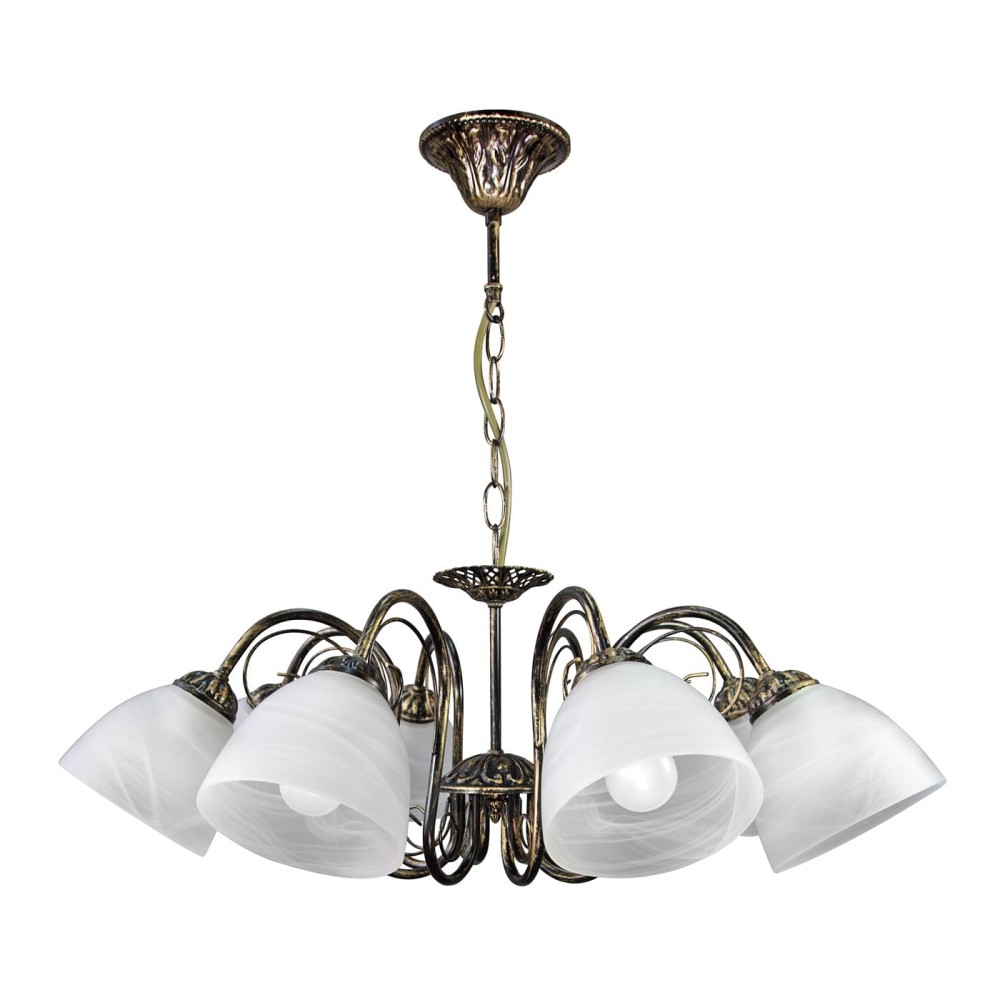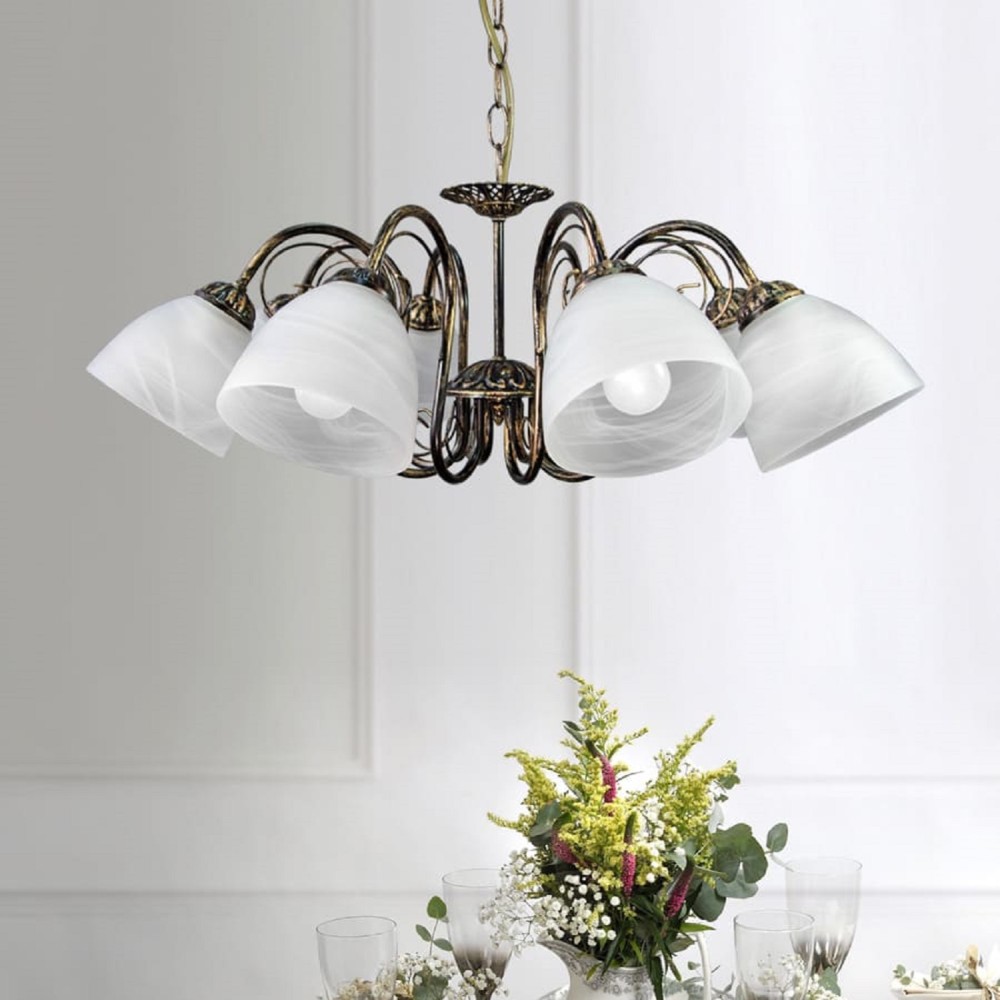 - Материалы: Корпус люстры выполнен из прочного и долговечного металла, обработанного патиной золота. Плафоны изготовлены из качественного стекла, обеспечивающего мягкое и рассеянное освещение.