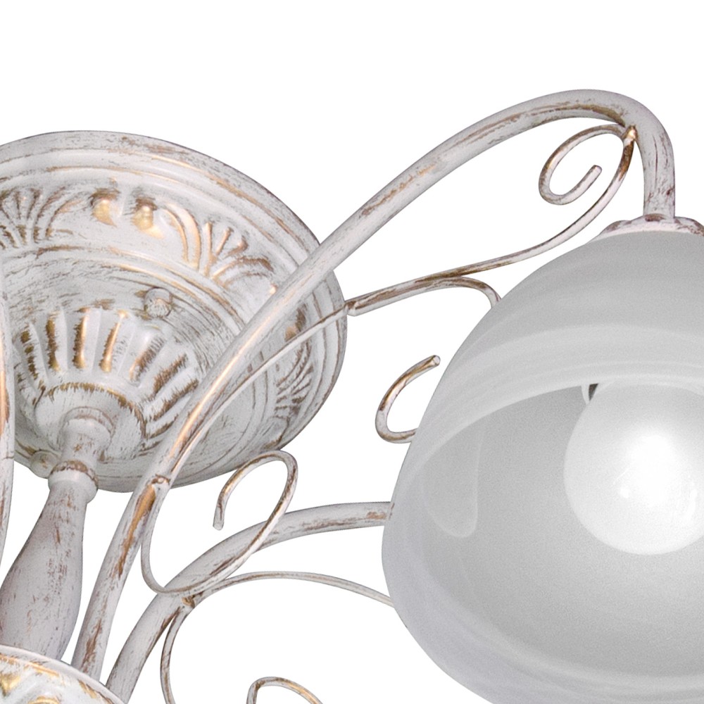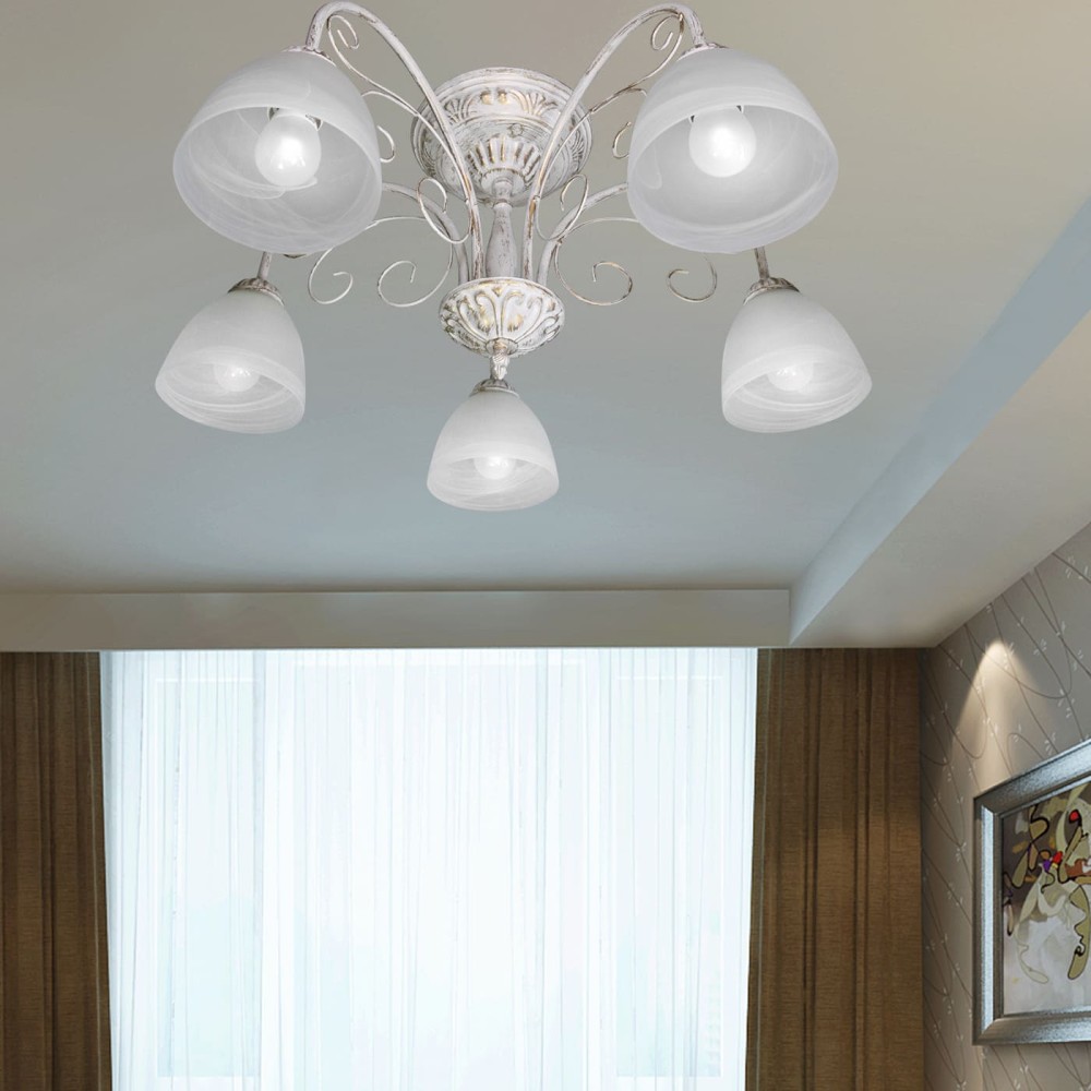 • Роскошный Дизайн: Люстра S2114-5 относится к стилям классики, неоклассики и прованса. Ее элегантный дизайн, выполненный из металла, белого цвета с патиной золота, создает атмосферу уюта и благородства. Использование патины золота придает светильнику глубину и текстуру, добавляя ему винтажный шарм. Белый цвет основания подчеркивает золотистые оттенки и обеспечивает универсальность, позволяя ей гармонично вписаться в различные цветовые схемы интерьера.