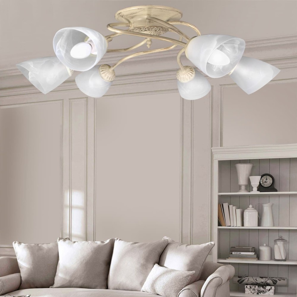 - Элегантный дизайн: Люстра S2151-6 отличается своим изысканным и благородным видом. Сочетание бежевого цвета с патиной золота создает мягкое, рассеянное освещение, которое идеально подходит для гостиной, спальни, столовой или прихожей. Ее размеры – ширина 70 см и высота 20 см – обеспечивают оптимальное визуальное восприятие и не перегружают пространство.