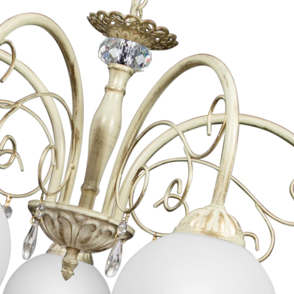 Люстра S2251-5 выполнен из металла, покрытого патиной золота, что придает ей винтажный и благородный вид. Бежевый цвет основания гармонично сочетается с золотой патиной, создавая эффект глубины и объема. Использование металла в конструкции обеспечивает долговечность и устойчивость к коррозии. Стекло, используемое для плафонов, придает светильнику прозрачность и позволяет свету свободно проникать, создавая мягкое и рассеянное освещение.