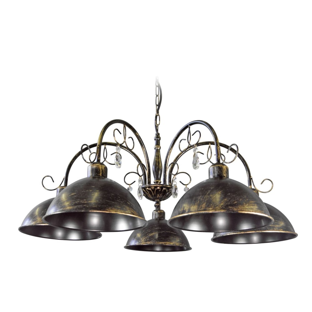 - 5 плафонов: Пяти плафонов достаточно, чтобы равномерно осветить большую площадь, обеспечивая комфортное и уютное освещение. Каждый плафон выполнен из металла и украшен хрустальными подвесками, которые не только красиво рассеивают свет, но и добавляют светильнику изысканности.