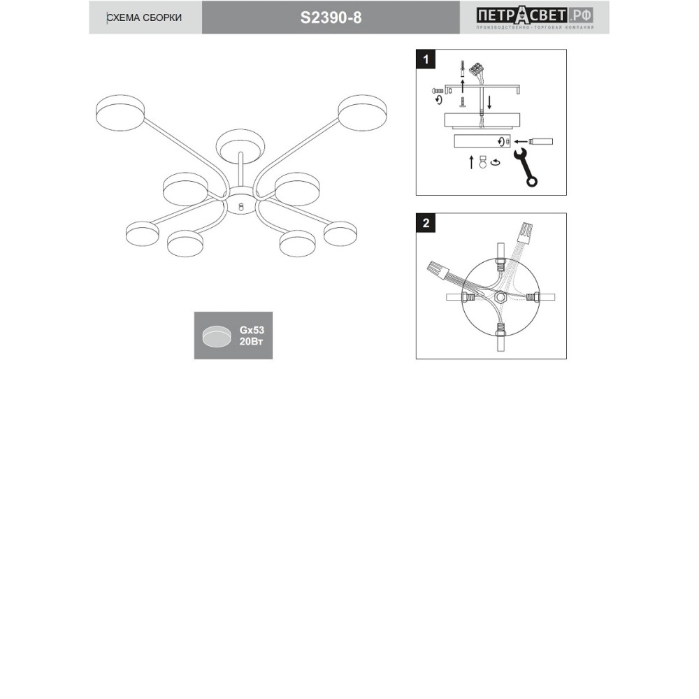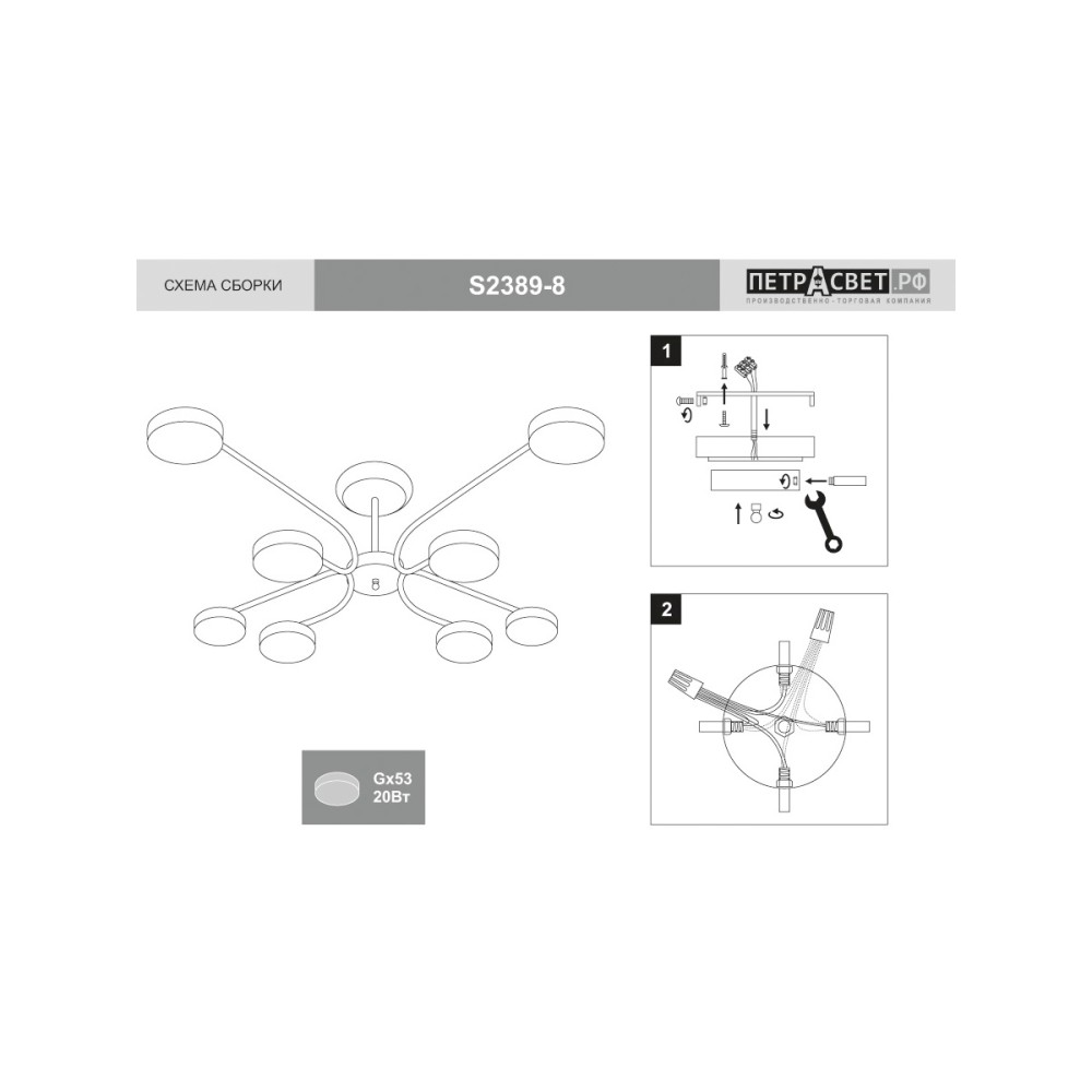 Эта люстра – это не просто источник света, это инвестиция в комфорт и стиль вашего дома. Сочетание современного дизайна, высокой эффективности, долговечности и гарантии от надежного российского производителя делает ее идеальным выбором для любого интерьера. Установка такой люстры позволит вам создать уютную и функциональную обстановку, в которой вам будет приятно проводить время. Ее элегантный внешний вид и яркое освещение преобразят ваш дом, добавив ему изысканности и привлекательности. Выбирая PETRASVET S2390-8, вы выбираете качество, надежность и стиль. Не упустите возможность сделать свой дом светлее и красивее! Эта люстра станет отличным подарком для себя или близких. Установите ее сегодня и наслаждайтесь комфортным и стильным освещением! Она идеально подойдет для создания атмосферы уюта и тепла в вашем доме. Надежность и долговечность – это то, что вы получите, приобретя эту светодиодную люстру. Помните, что правильное освещение играет важную роль в создании комфортной и продуктивной обстановки. PETRASVET S2390-8 – это решение, которое поможет вам создать идеальное освещение для любого помещения. Она не только обеспечит яркое и равномерное освещение, но и станет стильным акцентом в вашем интерьере. Выбирайте лучшее для своего дома! PETRASVET – это качество, которое вы можете доверять. Убедитесь в этом сами, заказав светодиодную люстру S2390-8. Мы уверены, что вы будете довольны своим выбором. Почувствуйте разницу, которую может внести качественное освещение в вашу жизнь. Закажите PETRASVET S2390-8 прямо сейчас! Создайте свой свет! Эта люстра – идеальное сочетание стиля, функциональности и надежности. Не упустите возможность сделать свой дом лучше! Помните, что правильный выбор освещения может значительно улучшить качество вашей жизни. PETRASVET – ваш надежный партнер в создании комфортного и стильного интерьера. Мы предлагаем широкий ассортимент светодиодных светильников для любых нужд и предпочтений. Позвольте нам помочь вам создать идеальное освещение для вашего дома! Закажите PETRASVET S2390-8 и наслаждайтесь ярким и экономичным светом! Свет – это жизнь! PETRASVET – свет для вашего дома! Люстра потолочная светодиодная большая черная российского производства на 8 лампочек ПЕТРАСВЕТ S2390-8, 8хGX53 макс, 20Вт, стиль - модерн, арматура - металл, цвет светильника- черный, размеры светильника (LxWxH) - 74x74x26, вес - 2 кг, Потолочный светильник LED рассчитан на натяжной потолок и освещение 24-32 м2 помещения в зависимости от мощности лампочек GX53, Люстра потолочная светодиодная 8 рожковая черная подходит для освещения комнат, кабинета, гостиной, спальни, столовой, детской, кухни, Заводская гарантия 7 лет, Люстра просто собирается, Светильник потолочный светодиодный хай тек LED легко собирается, Светодиодные люстры потолочные для дома крепятся к потолку стандартной потолочной планкой, размер потолочной чашки 12 см, Лампочки светодиодные LED подбираются по следующим параметрам: для яркого освещения - 3 Вт на 1 м2 комнаты, для среднего - 2 Вт на 1 м2, Рекомендованная мощность лампочек 7-9 Вт,