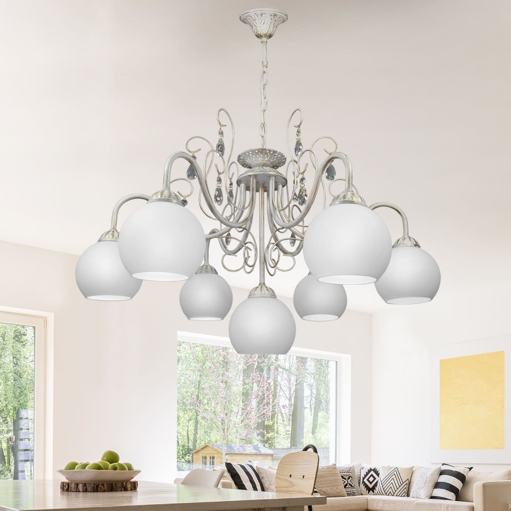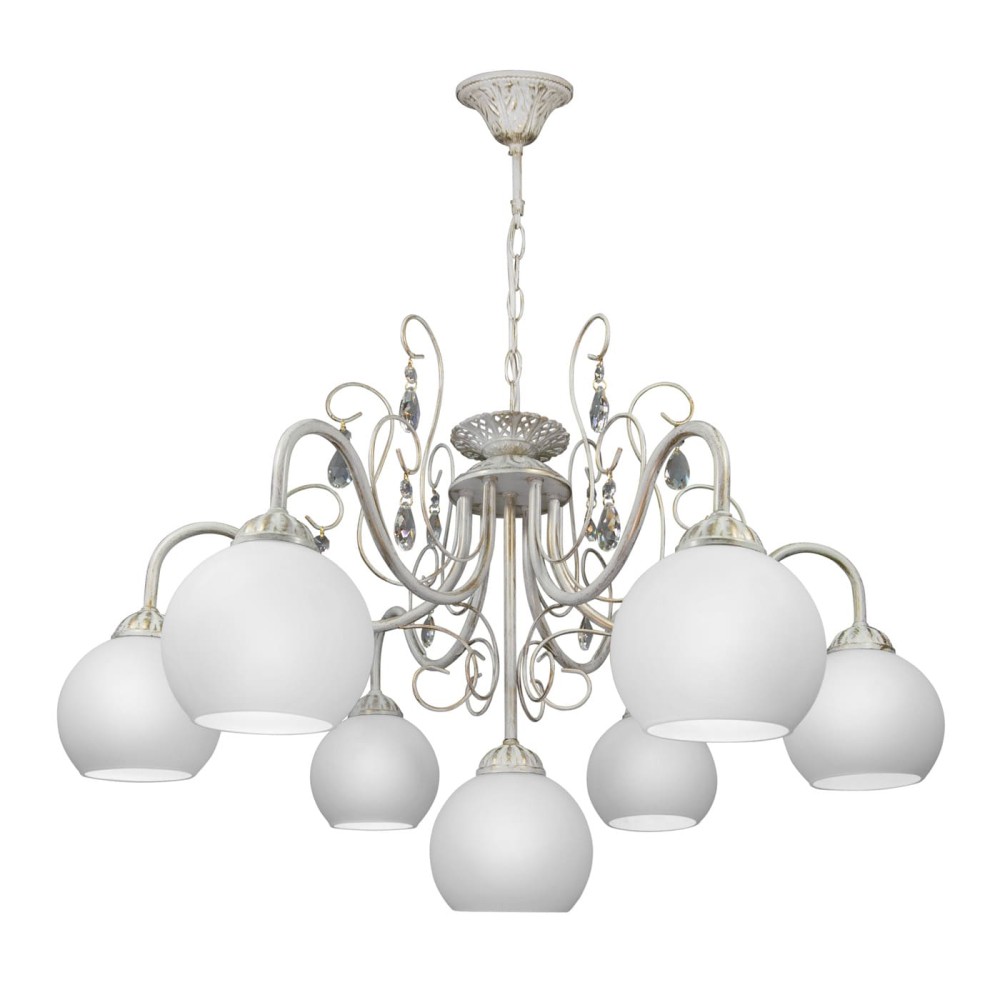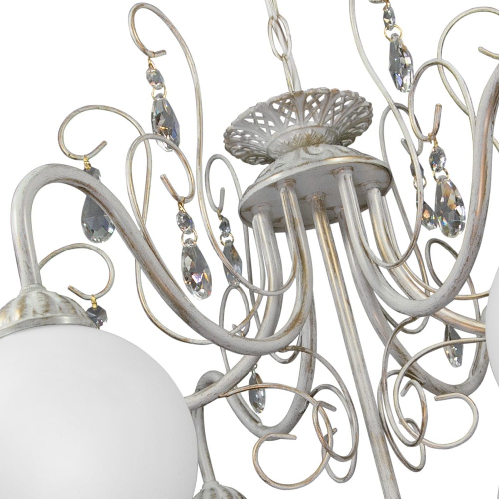 - Цвет: Белый с патиной золота – сочетание этих цветов создает эффектный и элегантный вид. Белый цвет плафона обеспечивает равномерное распределение света, а патина золота добавляет люстре роскоши и изысканности.