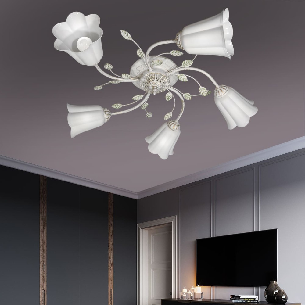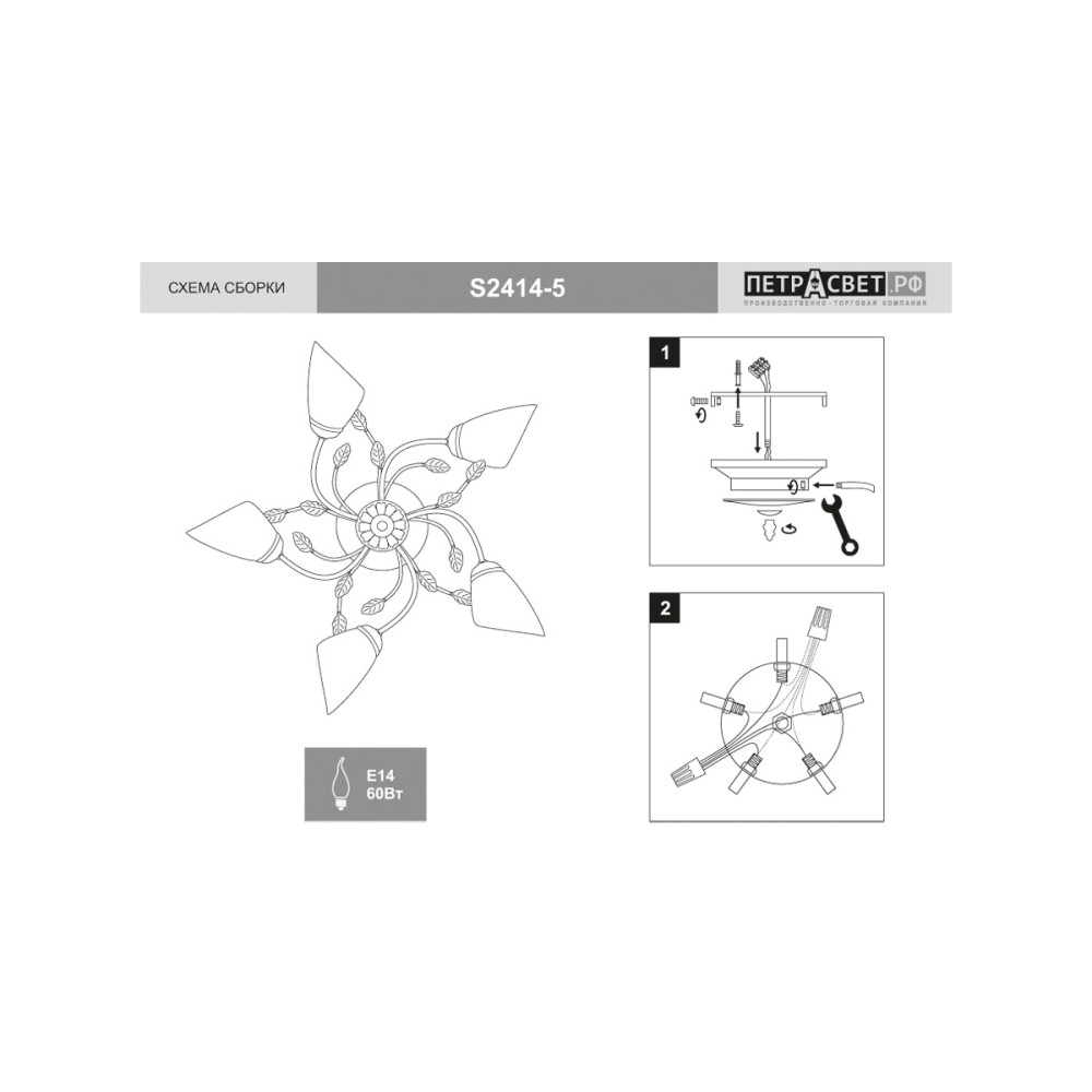 Ключевые слова для SEO: люстра, потолочная люстра, классическая люстра, неоклассическая люстра, прованс люстра, золотая люстра, патиная люстра, люстра с патиной, люстра с золотом, PETRASVET, люстра купить, люстра недорого, люстра 5 ламп, люстра E14, люстра 220В, люстра для гостиной, люстра для спальни, люстра для столовой, люстра потолочная, купить люстру, классическая люстра купить, недорогая люстра. Люстра потолочная с листочками дизайнерская Петрасвет производство люстр №1 в России S2414-5, 5хЕ14 макс, 60Вт, стиль - классикая флористика, цветочные люстры, арматура - металл, цвет светильника- белый с патиной золота, размеры светильника (LxWxH) - 72x72x20, вес - 1 кг, Люстра на 2 включения, Люстра потолочная для натяжных потолков и освещение 15-20 м2 помещения в зависимости от мощности лампочек Е14, Все светильники с цветами и листьями подходят и для натяжных и подвесных потолков, Люстра потолочная пяти рожковая подходит для освещения комнат, кабинета, гостиной, спальни, столовой, детской, кухни, Люстра просто собирается по инструкции, Заводсткая гарантия завода Петрасвет 7 лет, Люстра 5 рожковая потолочная плотно уложен в коробке, Потолочная люстра 5 рожковая просто собирается, крепится к потолку стандартной потолочной планкой длиной 18 см, Лампочки светодиодные LED подбираются по следующим параметрам: для яркого освещения - 3 Вт на 1 м2 комнаты, для среднего - 2 Вт на 1 м2, В случае боя или не комплекта, вышлем новый за свой счет в день обращения,