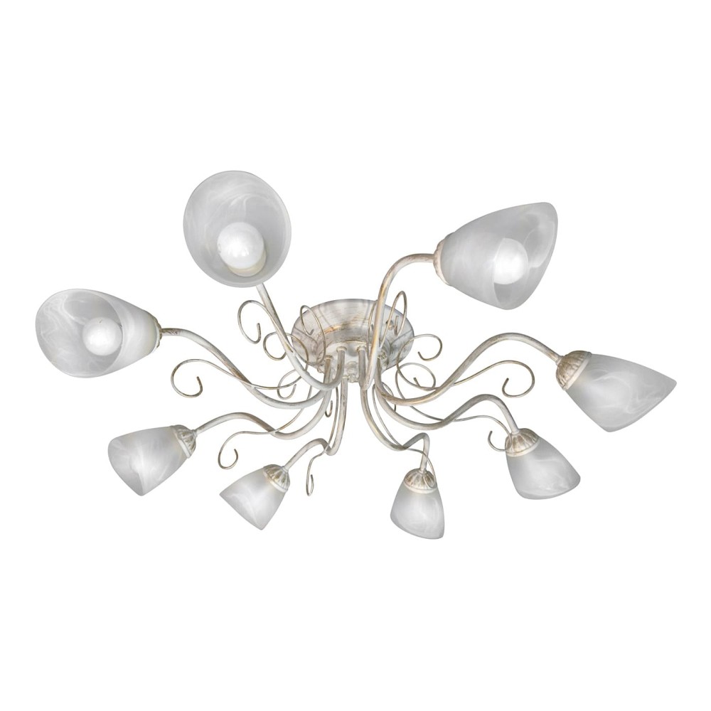 - 8 плафонов: Благодаря 8 плафона, люстра обеспечивает равномерное и достаточно яркое освещение площади до 35 квадратных метров. Каждый плафон выполнен из стекла, что придает конструкции легкость и воздушность.