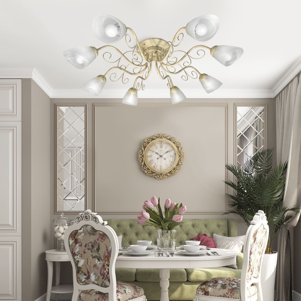 Люстра S2426-8 изготовлена из прочного металла, покрытого патиной золота, что придает ей неповторимый, благородный вид. Сочетание золотистых оттенков и классического дизайна делает ее универсальной и подходящей для различных интерьерных решений – от роскошных залов до уютных гостиных и столовых. Материал плафона – стекло, что обеспечивает оптимальное рассеивание света и создает мягкое, приятное освещение. Прочная конструкция гарантирует долгий срок службы.