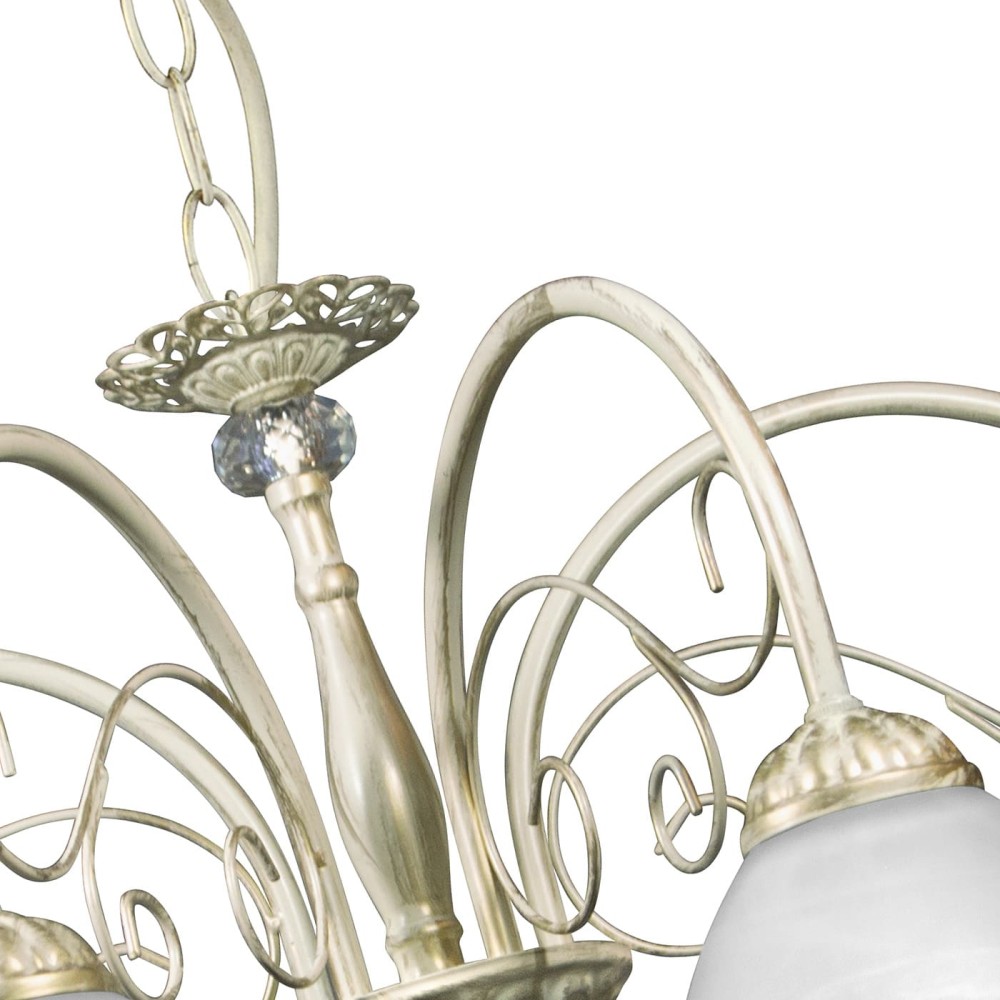 Люстра изготовлена из высококачественного металла, окрашенного в элегантный бежевый цвет с патиной золота. Этот цвет прекрасно сочетается с различными интерьерными стилями, добавляя им изысканность и глубину. Материал плафона – стекло, что обеспечивает его долговечность и устойчивость к повреждениям. Металлическое основание обеспечивает прочность и надежность конструкции. Декоративные хрустальные вставки добавляют люстре роскоши и блеска, подчеркивая ее изысканный дизайн.