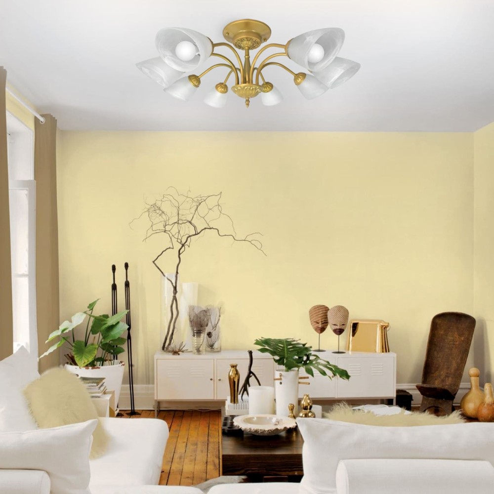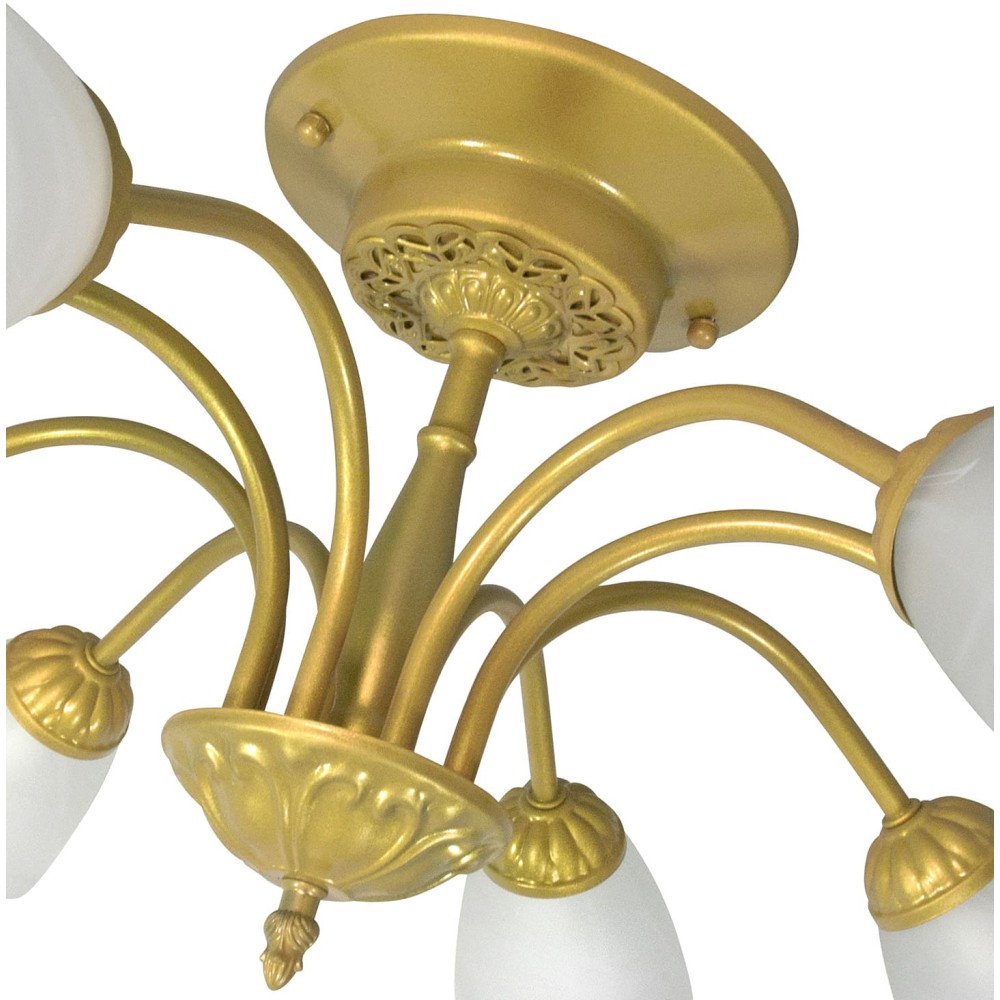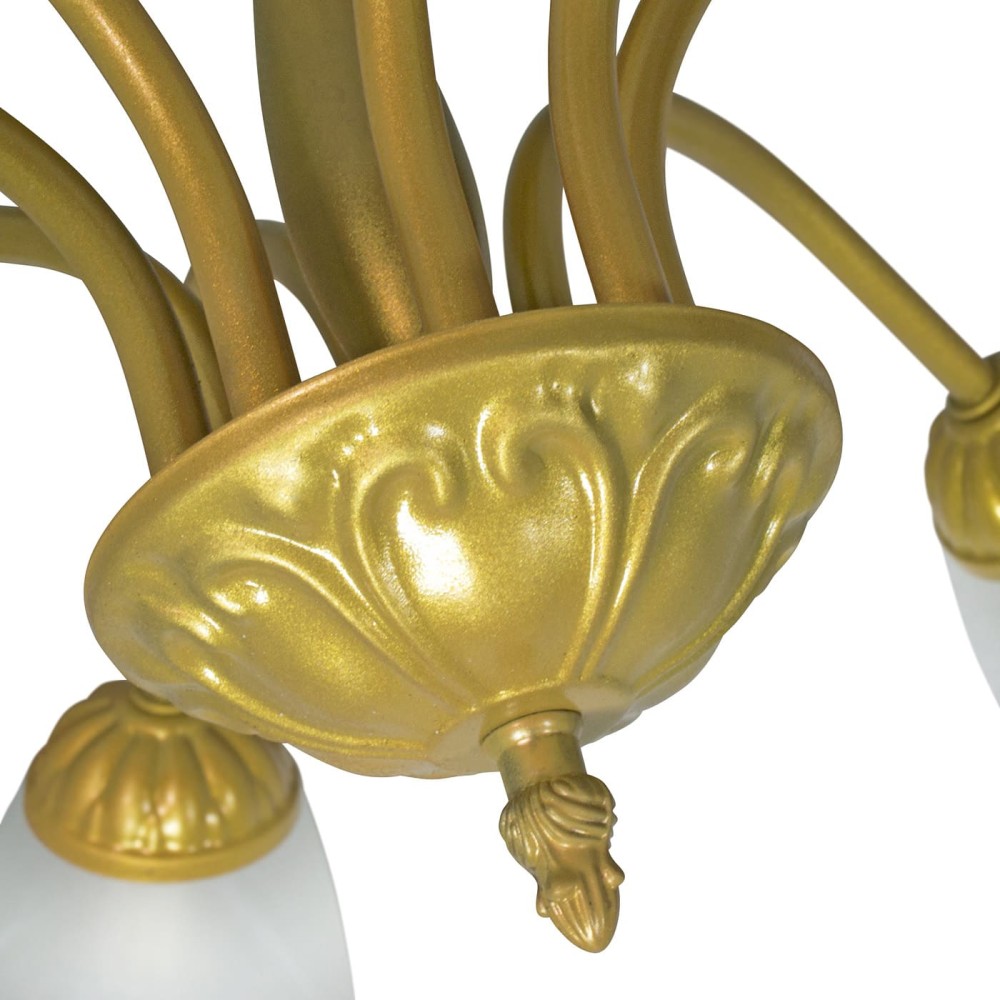 - Материалы: Корпус светильника выполнен из прочного и долговечного металла, окрашенного в цвет золота с патиной золота. Плафоны изготовлены из стекла, обеспечивающего оптимальное рассеивание света.