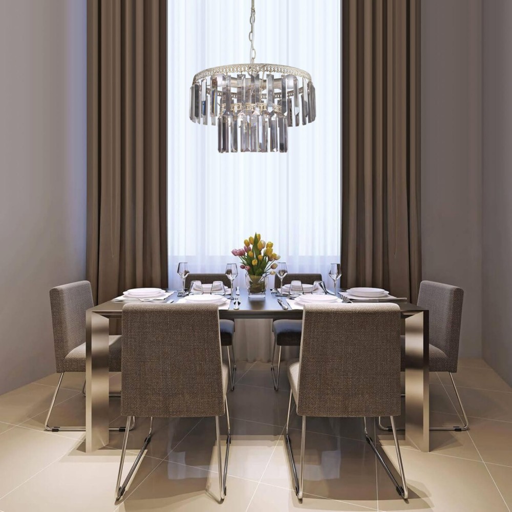 Материал плафона – хрусталь, который является ключевым элементом этой люстры. Изящные хрустальные подвески, выполненные в форме капель, рассеивают свет, создавая завораживающий эффект мерцания. Хрусталь не только красиво выглядит, но и обладает отличными светоотражающими свойствами, обеспечивая равномерное и комфортное освещение. Благодаря этому, люстра идеально подходит для создания романтической атмосферы в спальне или гостиной.