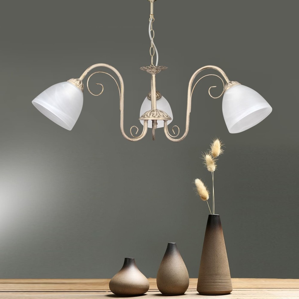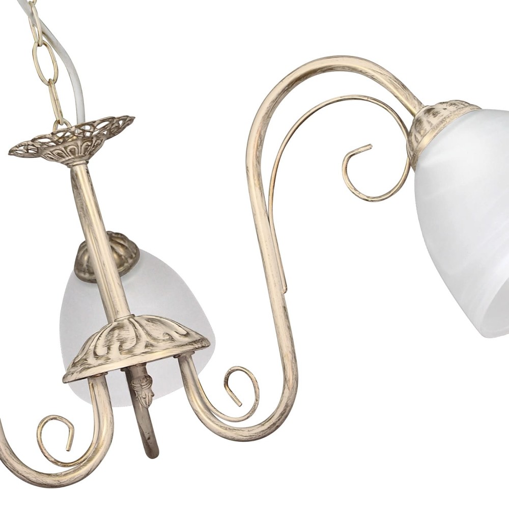 - Материалы: Корпус люстры выполнен из прочного и долговечного металла, обработанного патиной золота, что придает ей винтажный вид и защищает от коррозии. Плафоны изготовлены из стекла, обеспечивающего отличную рассеянность света. Основание люстры также выполнено из металла.
