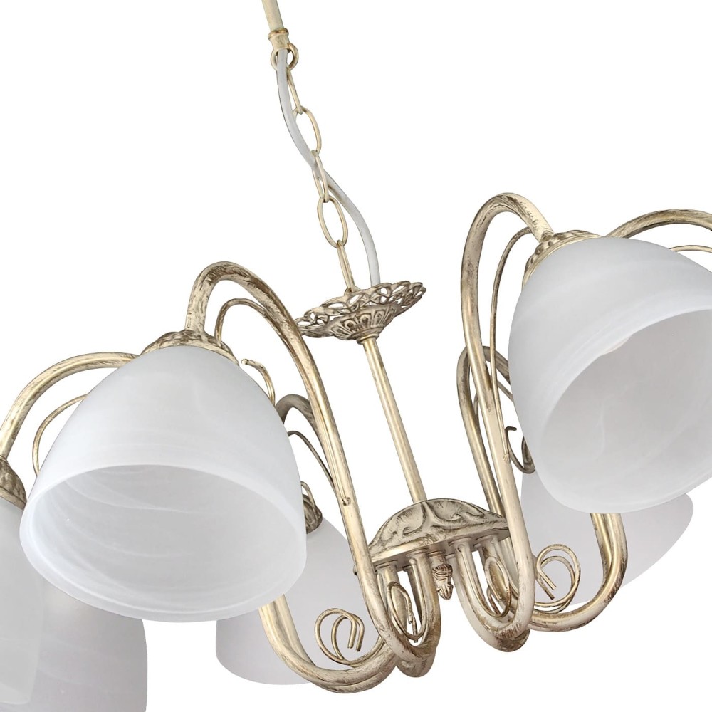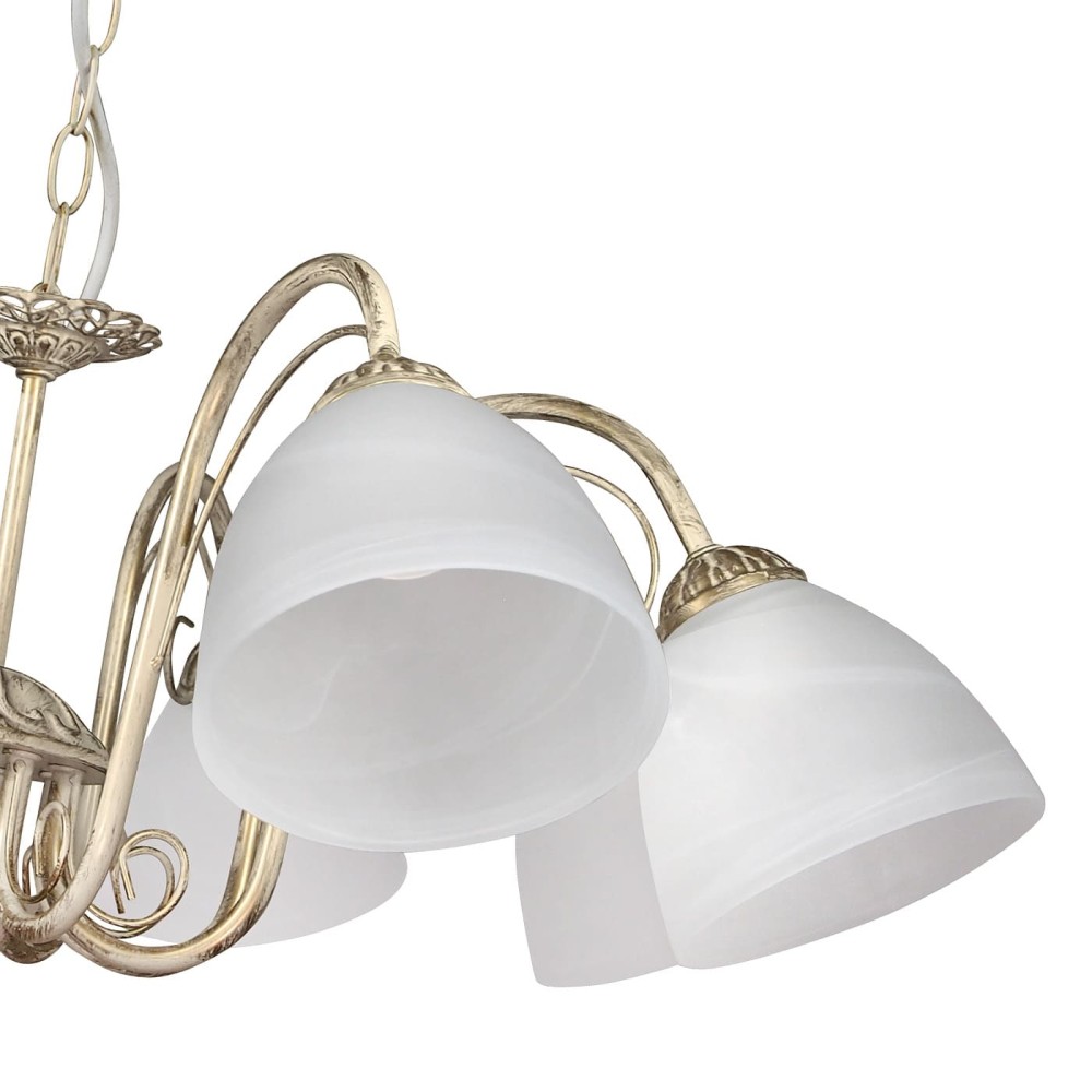 - Материалы: Светильник выполнен из прочного и долговечного металла, покрытого патиной золота. Это придает ему благородный и винтажный вид, а также защищает от коррозии. Плафоны изготовлены из матового стекла, которое обеспечивает мягкое и рассеянное освещение.