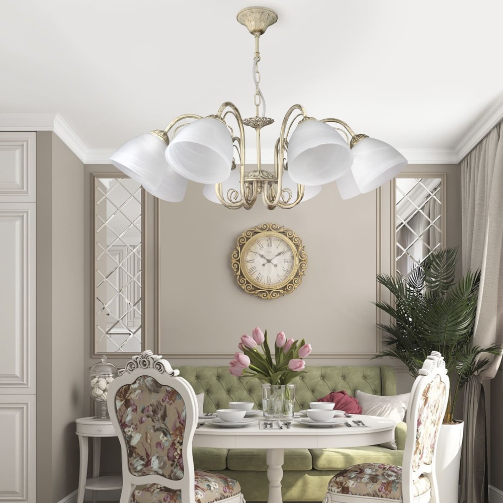 - Стиль: Люстра сочетает в себе элементы классики, неоклассики и прованса, что делает ее универсальной и подходящей для различных интерьерных решений. Ее благородный внешний вид и изысканные детали подчеркнут статус и вкус владельца.