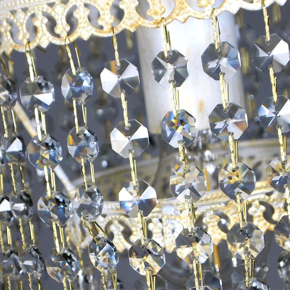 - Материал: Металл с патиной золота – прочный, долговечный и создает приятное теплое освещение. Хрусталь – обеспечивает превосходное рассеивание света и добавляет роскоши.