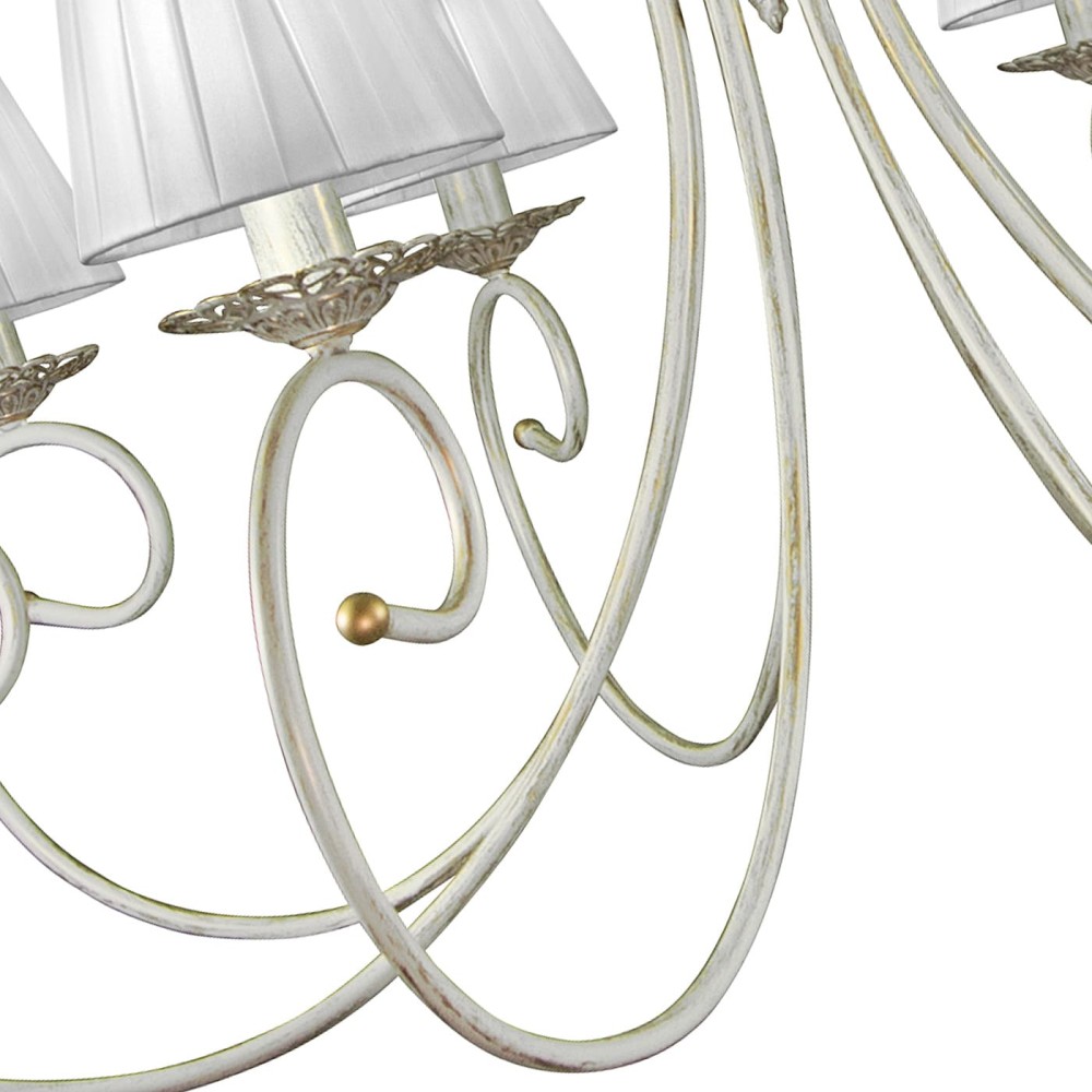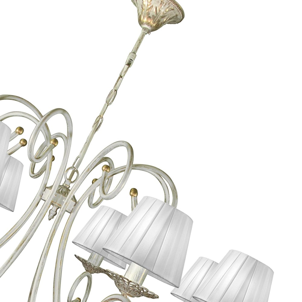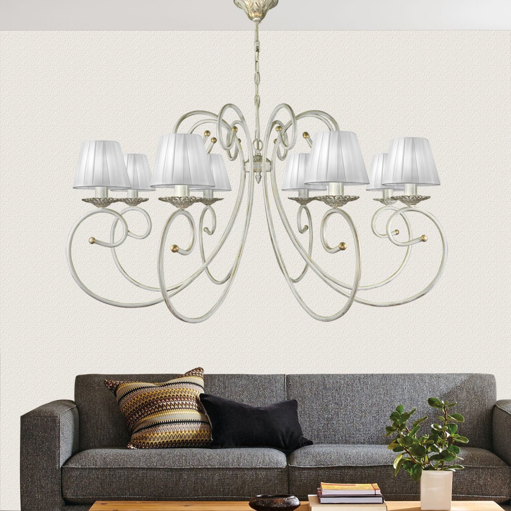 Люстра S3014-8 выполнена в стилях классики, неоклассики и прованс, что делает ее универсальным выбором для различных дизайнерских концепций. Изысканное сочетание белого металла с патиной золота создает неповторимый эффект, добавляя интерьеру нотку ретро-шика и благородства. Абажуры из ткани, выполненные в классическом стиле, мягко рассеивают свет, создавая уютную и расслабляющую атмосферу. Широкое основание (12 см) придает конструкции устойчивость и солидность.