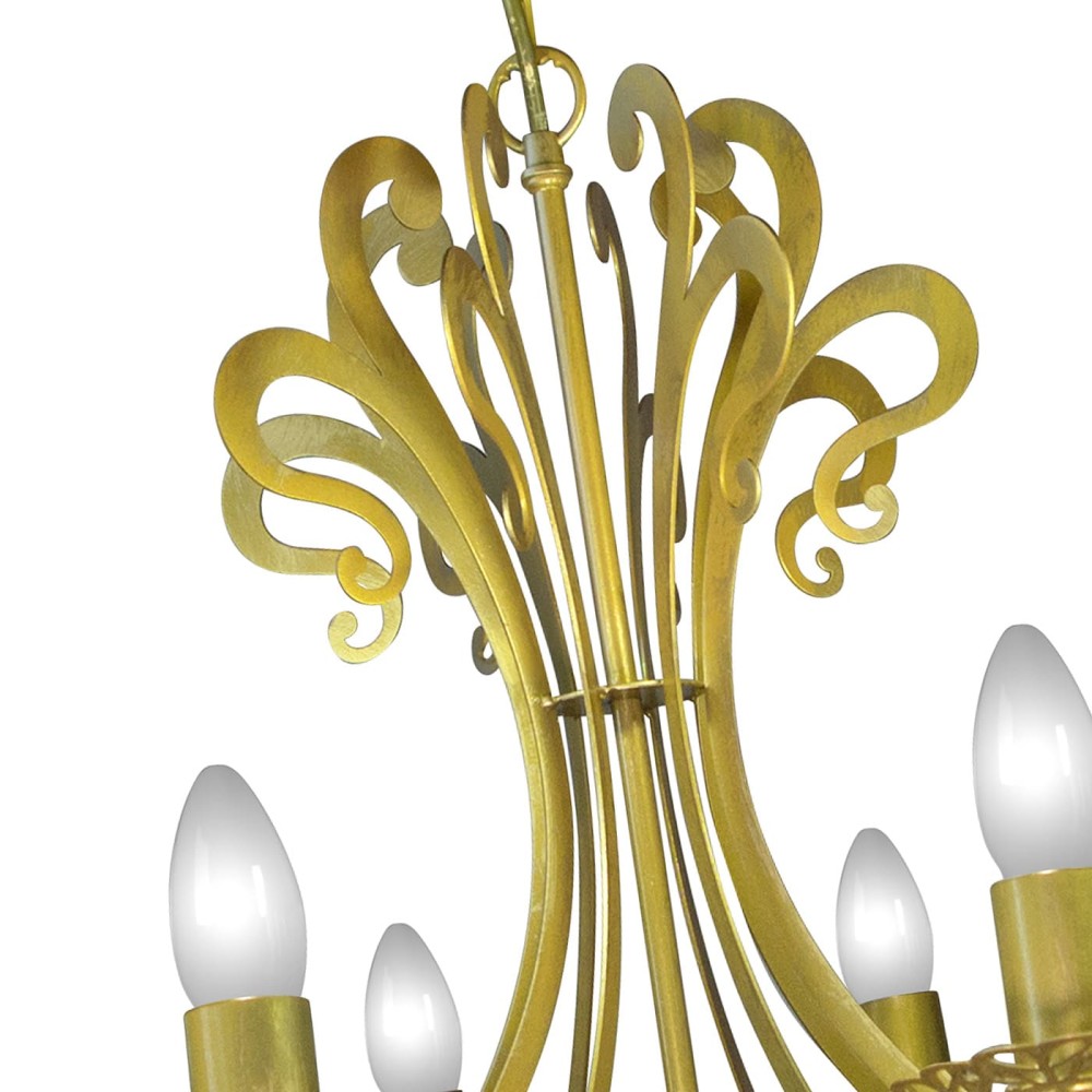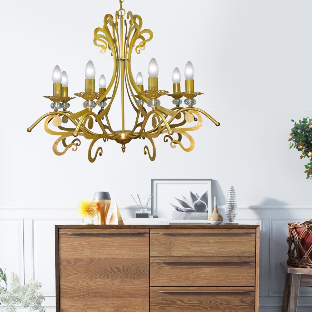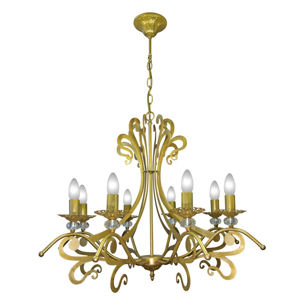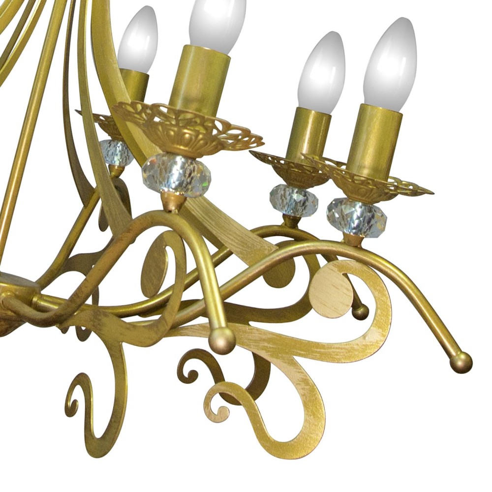 - Роскошное оформление: Люстра выполнена из высококачественного металла, покрытого патиной золота, что придает ей благородный и элегантный вид. Использование хрустальных вставок добавляет блеска и изящества, подчеркивая ее статус.